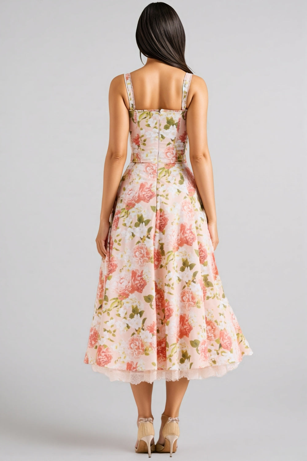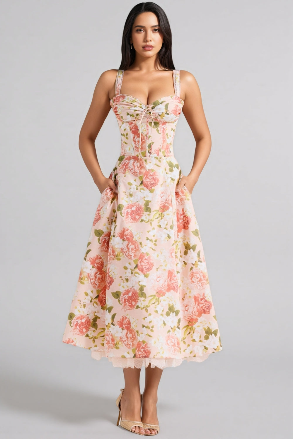 The Aelin Pink Halter Print Midi Dress is a stunning piece that combines classic floral patterns with contemporary design elements. Crafted from lightweight fabric. this dress features a halter neckline with delicate spaghetti straps. adding a touch of femininity to the ensemble. The bodice is adorned with intricate ruching details. enhancing its shape and providing a flattering fit.