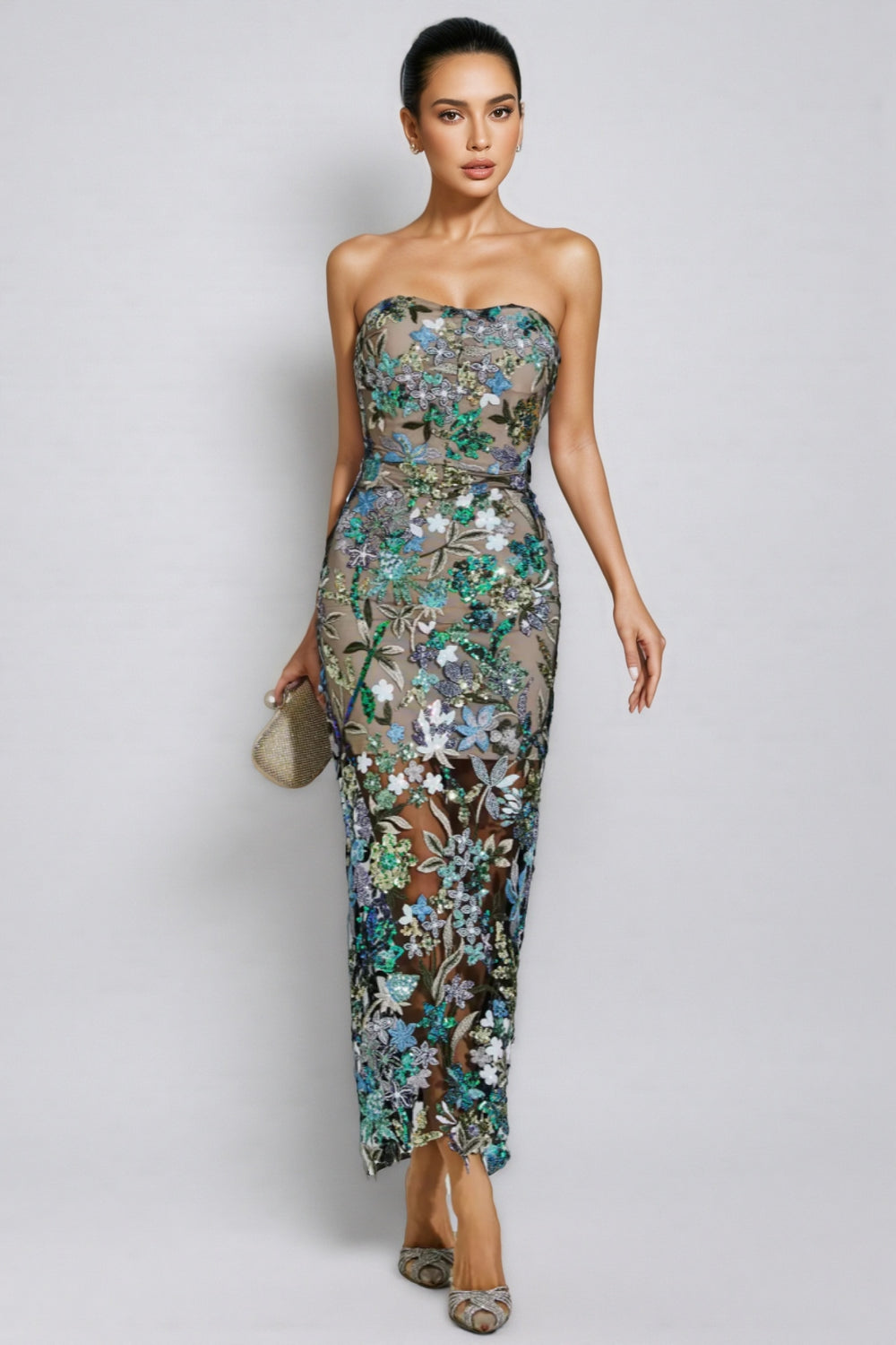 The Aisia Sequin Floral Maxi Dress-Blue is the picture of a hundred flowers in bloom. This dress is brought to life with a vibrant floral print. with kaleidoscopic flowers dancing across the fabric. injecting it with energy and glamour. The sheer overlay. embellished with intricate sequins. adds a layer of depth and texture. catching the light and creating subtle shimmer.