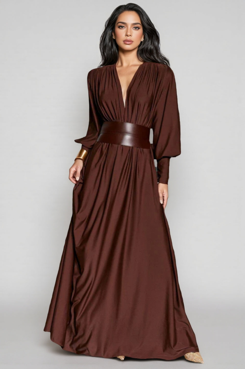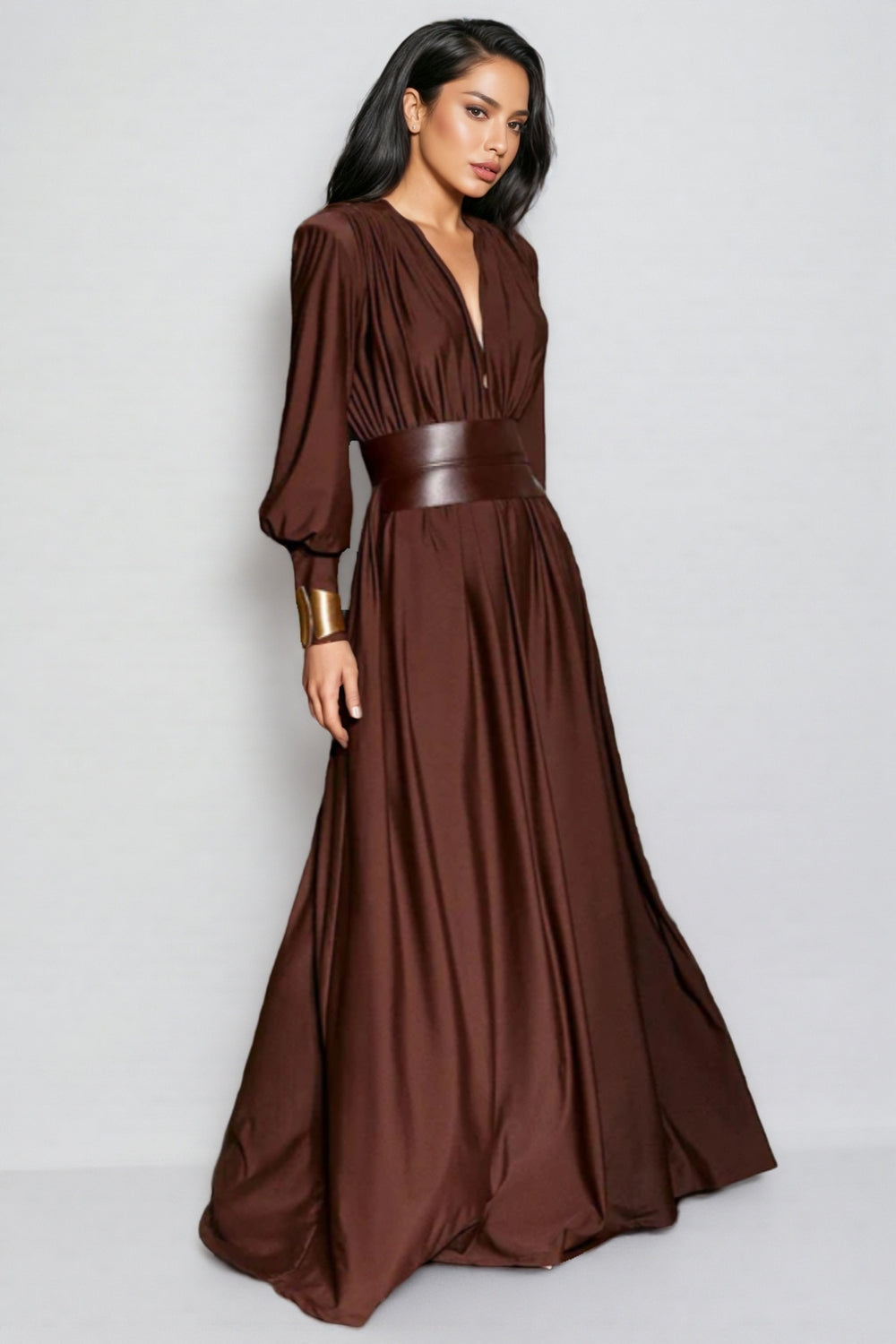 The Alma Brown Long Sleeve Maxi Dress features a classic A-line silhouette that cleverly embellishes the body. making it particularly suitable for both formal occasions and casual gatherings. The exquisite V-neck design not only highlights the feminine temperament. but also adds a touch of mystery. making people unable to resist the desire to delve into the story behind it. Whether it's a date. party. or business event. it can make you the center of attention. Moreover. its colors are also very versatile. making it easy to match bags and accessories of various colors to create your own unique style.