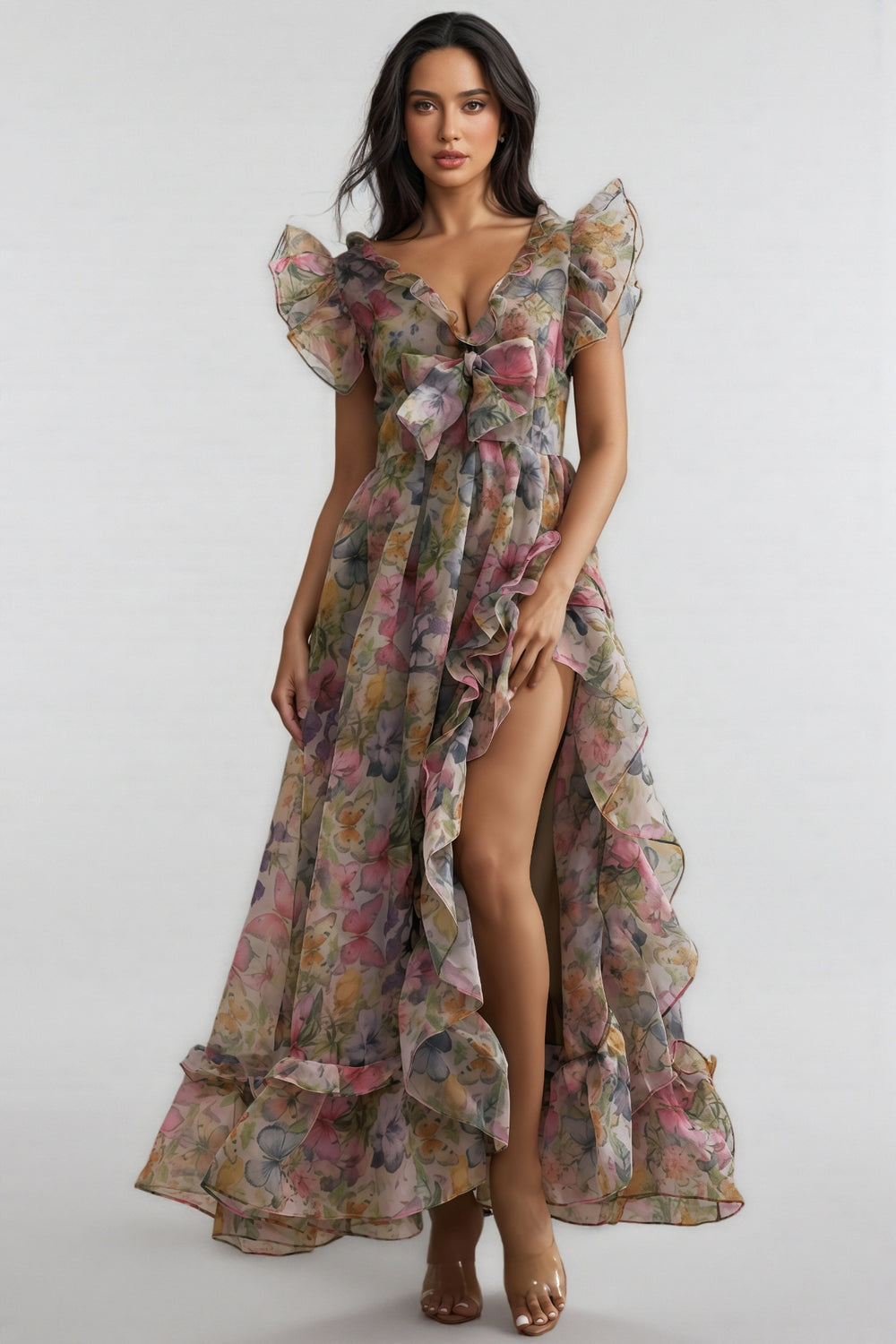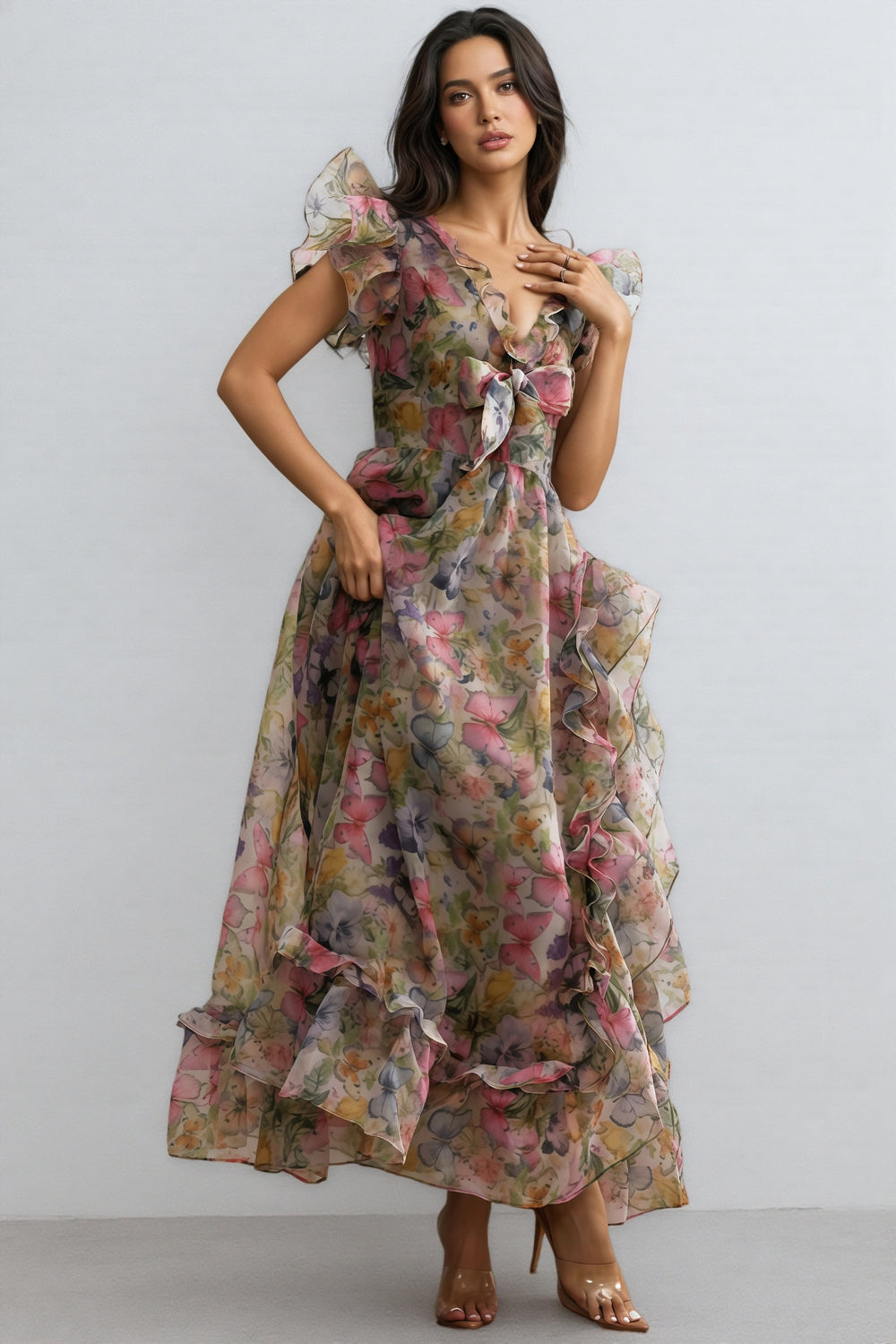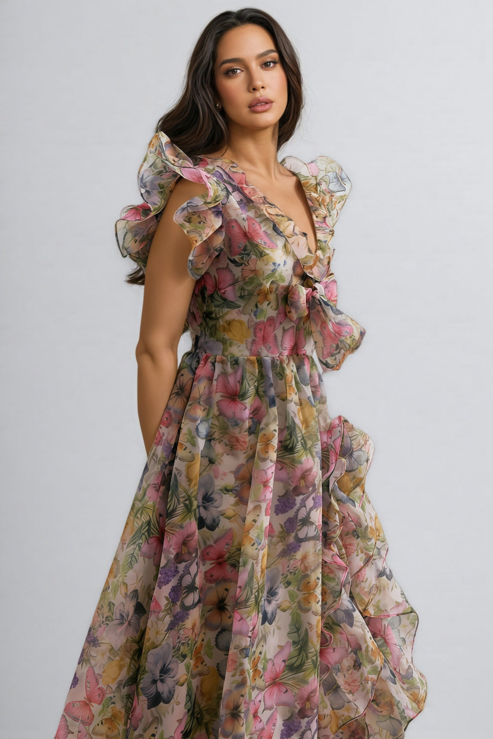 The Bella Butterfly Print Ruffle Chiffon Maxi Dress is a whimsical and enchanting choice for special occasions. This dress features a delicate butterfly print on lightweight chiffon fabric. creating an airy and ethereal look. The ruffled details add texture and dimension. while the flowing maxi length provides a graceful silhouette. Perfect for weddings. garden parties. or summer soirees. this dress combines elegance with a touch of nature-inspired magic.