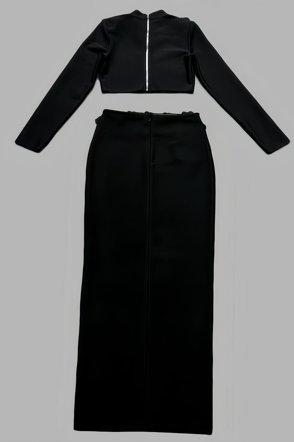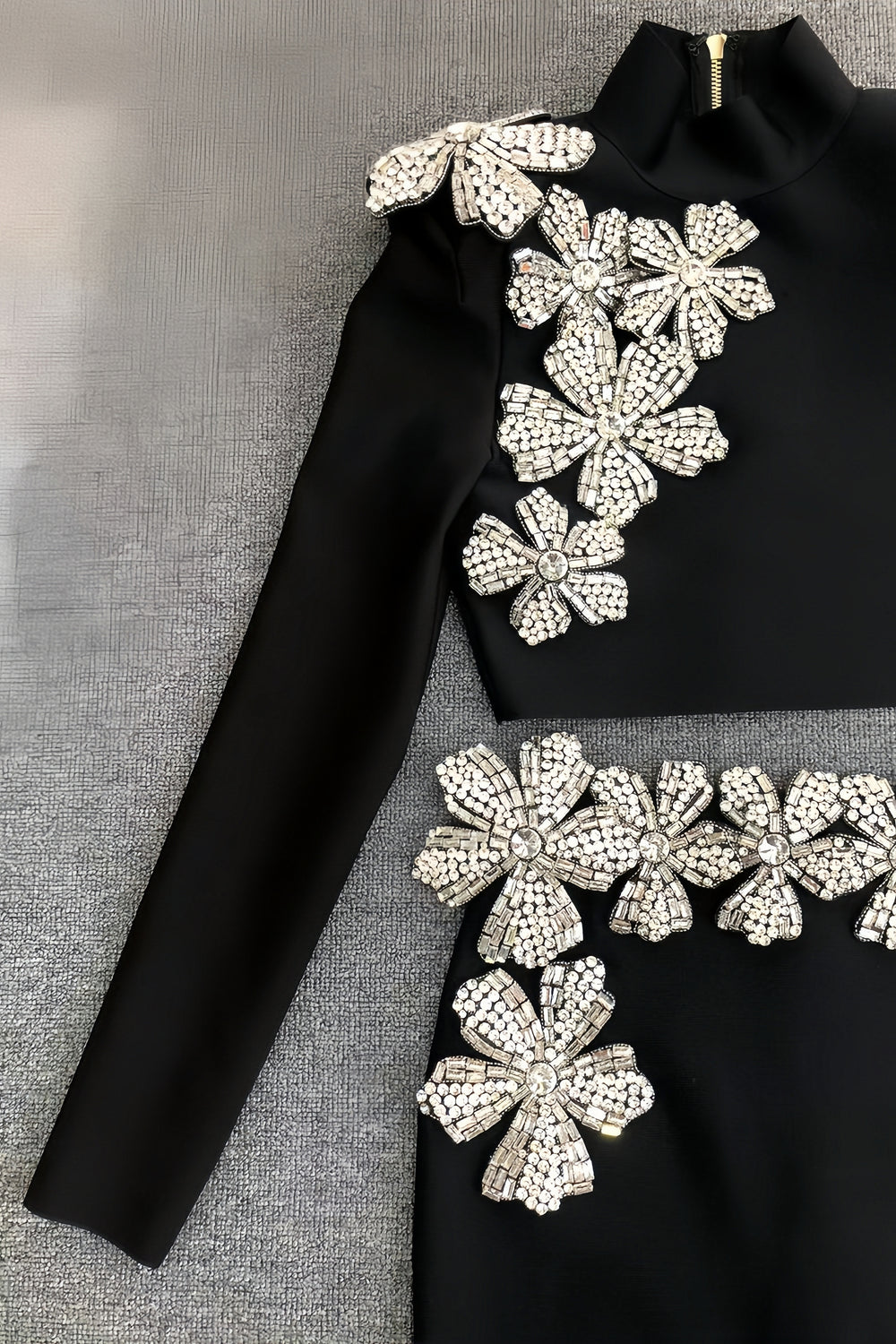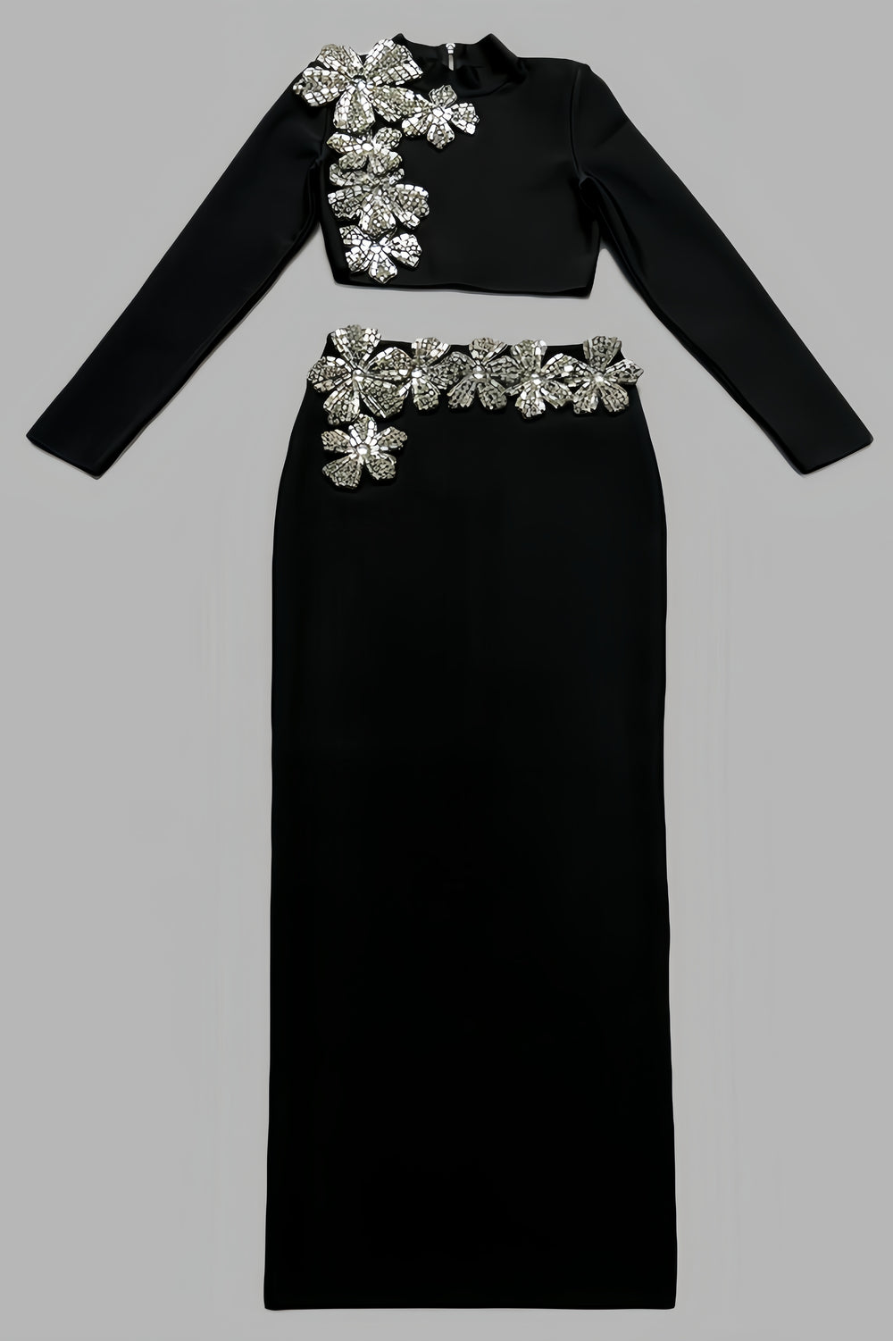 The Calia High Neck Top Maxi Dress Two-Piece Set resonates with the confidence and composure of the woman wearing it. The high-waisted skirt is a masterpiece of tailoring. featuring a corset-inspired design that subtly accentuates the waist. Its structured silhouette flows gracefully. creating a glamorous silhouette that catches the eye. Adorned with studded diamond three-dimensional flowers. the high-neck sheath top and long bustier skirt are self-contained. making you fully prepared for all occasions.