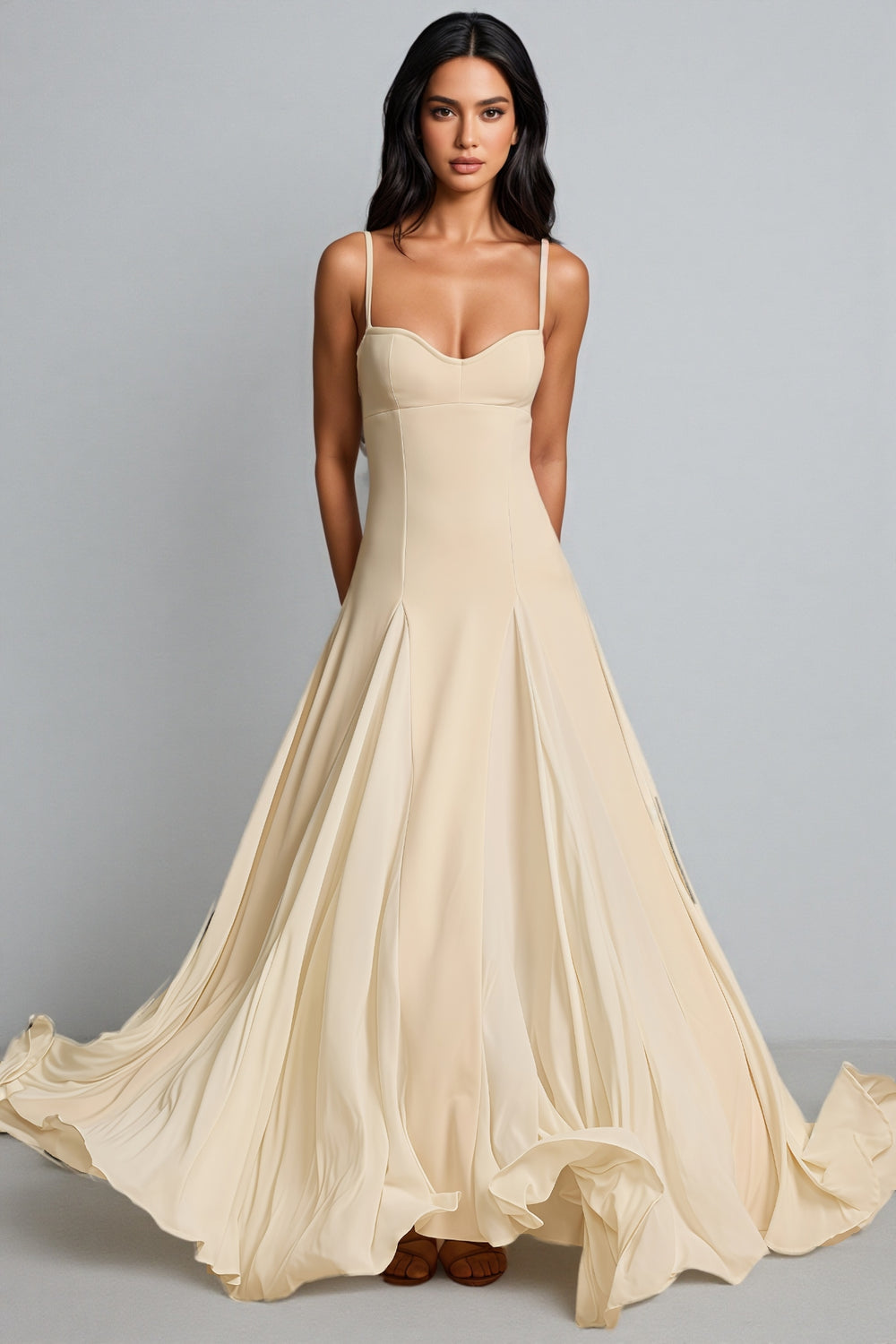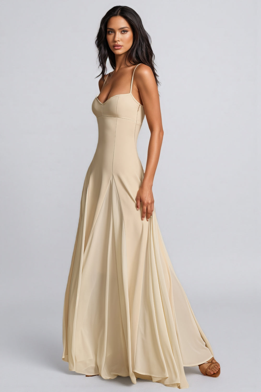 The Caroline White Strap Maxi Dress is an elegant and minimalist maxi dress that blends thin straps with a sweetheart neckline and a flowing silhouette for a sophisticated. event - ready look. Crafted from a smooth. light - weight white fabric. it features delicate spaghetti straps and a fitted bodice with a subtle sweetheart neckline. enhancing femininity. The skirt transitions into a floor - length style with soft pleats along the sides. creating movement and grace as it drapes elegantly. The clean. neutral hue offers versatility. making it perfect for evening galas. formal dinners. or wedding receptions. This dress balances simplicity with a sleek silhouette and maxi length. ensuring a captivating. timeless look for those who embrace understated elegance. Its combination of thin straps. sweetheart neckline. and flowing fabric makes it an ideal choice for making a memorable. refined statement.