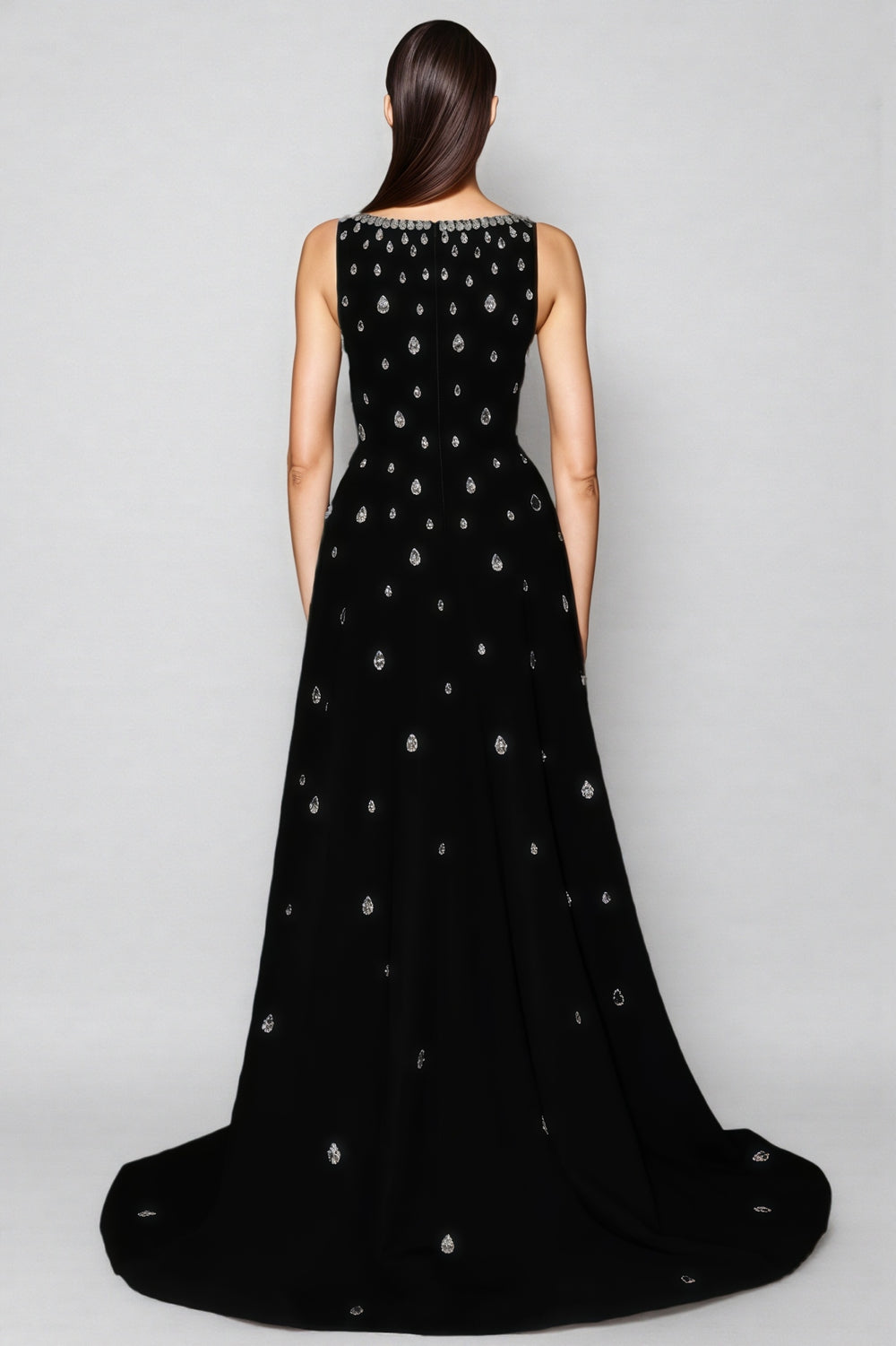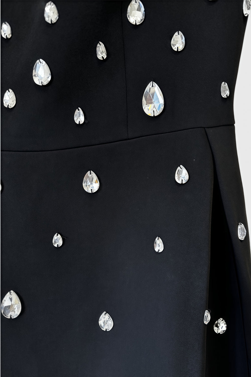 The Conjunto Black Diamond Sleeveless Maxi Dress is an elegant and sophisticated maxi dress that blends a sleeveless design with diamond - like embellishments and a flowing silhouette for a refined. red - carpet ready look. Crafted from smooth black fabric. it features a square neckline and thin straps. adding a touch of classic sophistication. The bodice is adorned with scattered teardrop - shaped diamond - like embellishments. while the neckline is framed by a dense row of smaller diamonds. creating a luxurious. eye - catching effect. The skirt flows into a floor - length A - line style with a subtle train. offering movement and drama. The deep black hue provides a timeless backdrop for the sparkling details. making it perfect for gala dinners. award ceremonies. or black - tie events. This dress balances opulent embellishments with a graceful silhouette. ensuring a captivating. high - impact look for those who embrace timeless. glamorous fashion. Its combination of diamond - like detailing. sleeveless design. and maxi length makes it an ideal choice for making a memorable. dazzling statement.