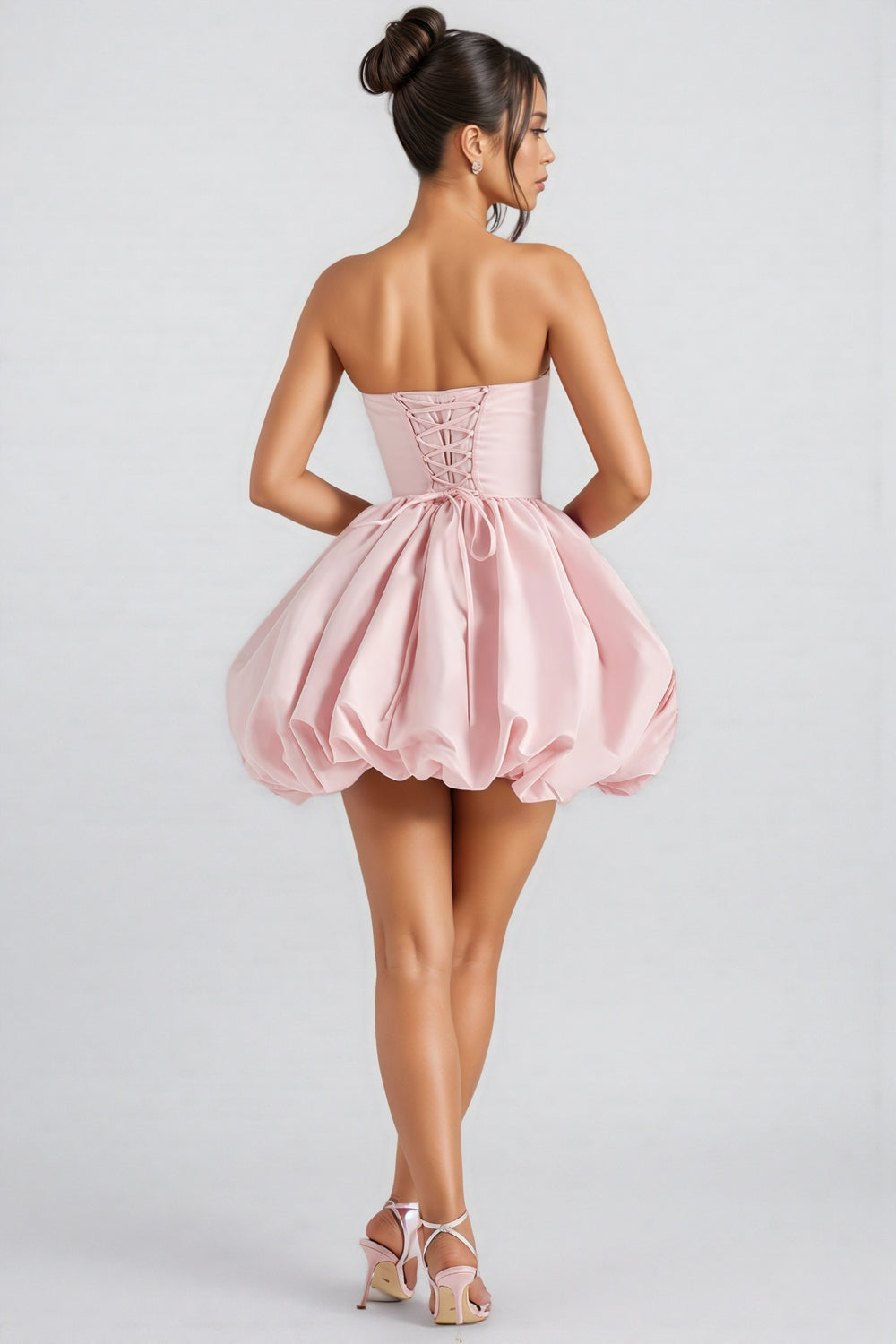 The Cordt Pink Bow Halter Lantern Mini Dress is a charming and whimsical piece that radiates femininity and playfulness. This pink dress features a halter neckline with a bow detail at the collar. adding a touch of sweetness to the overall look. The bodice is fitted and structured. transitioning seamlessly into a voluminous lantern-style skirt that creates a full and dramatic silhouette. The skirt's ruffled edges add texture and movement to the dress. enhancing its enchanting appeal. Paired beautifully with matching pink high-heeled sandals. this dress is perfect for special occasions. parties. or any event where a touch of fairy-tale magic is desired.