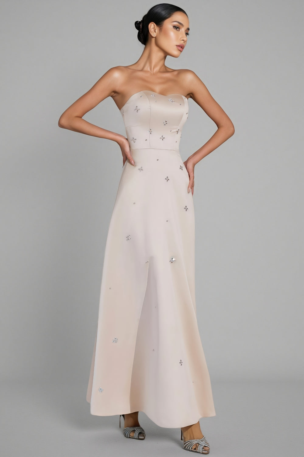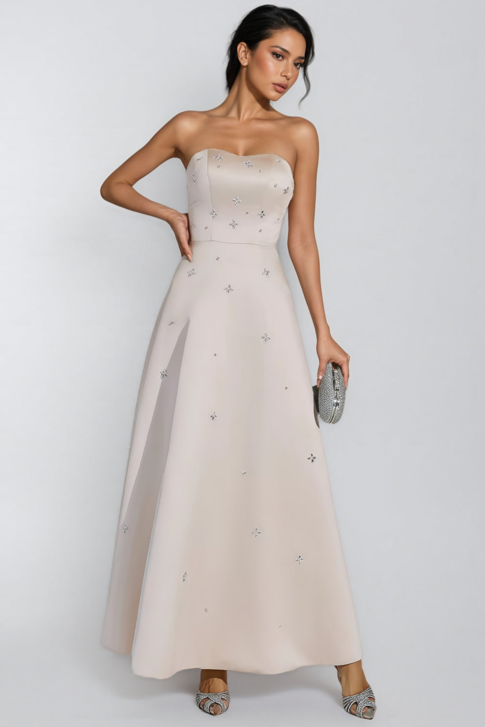 The Davin Champagne Off-shoulder Maxi Dress is a stunning piece that exudes elegance and glamour. This dress features an off-shoulder neckline that gracefully reveals the shoulders. paired with a fitted bodice that accentuates the figure before cascading into a floor-length skirt. The champagne-colored fabric gives the dress a luxurious feel. enhanced by subtle shimmering details throughout. Perfect for formal events or romantic evenings. this dress embodies timeless sophistication and grace.
