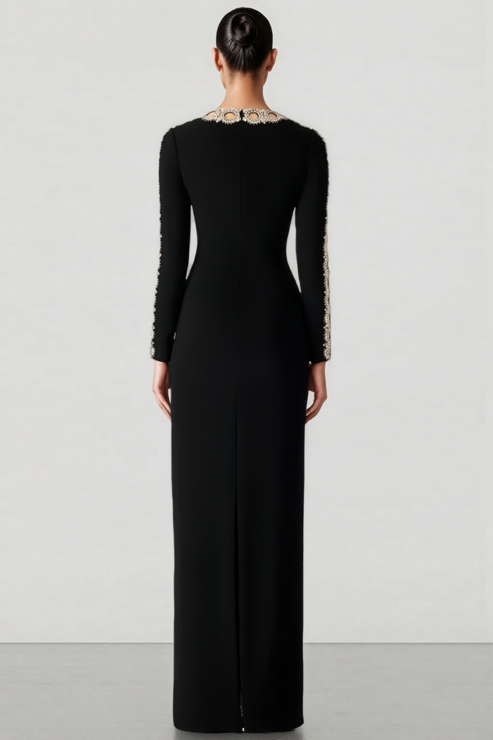 The Eiratk Black Openwork Beaded Maxi Dress is a sleek and sophisticated piece that masterfully blends minimalism with intricate detailing. Crafted from smooth black fabric. this maxi dress features a round neckline with delicate openwork cutouts. framed by a border of shimmering beads that add a touch of glamour. Long sleeves are adorned with vertical rows of beading along the edges. extending the refined aesthetic from the neckline down. The form-fitting silhouette highlights the figure. while the floor-length design ensures an elegant. statuesque presence. Perfect for formal events. evening galas. or occasions requiring understated luxury. this dress balances timeless elegance with modern craftsmanship. making it an ideal choice for those who appreciate refined style.