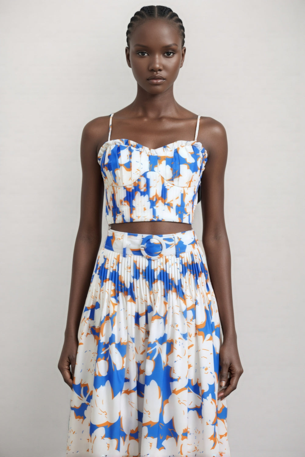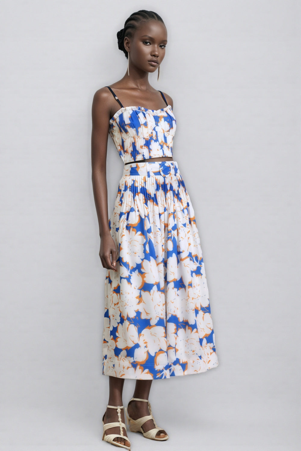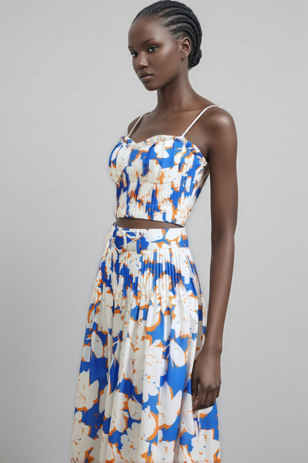 The Embet Floral Print Puffy Sleeve Maxi Dress Set is a vibrant and eye-catching ensemble perfect for making a bold fashion statement. This two-piece set features a crop top with puffy sleeves adorned with a striking floral print in shades of blue. white. and orange. The top has a gathered neckline and thin straps. adding a touch of elegance and femininity.Paired with the top is a high-waisted maxi skirt that complements the top perfectly. The skirt showcases the same floral print and has a fitted waistband that accentuates the figure before flowing down to ankle length. The combination of the puffy sleeves and the full skirt creates a balanced and harmonious silhouette that is both modern and timeless.