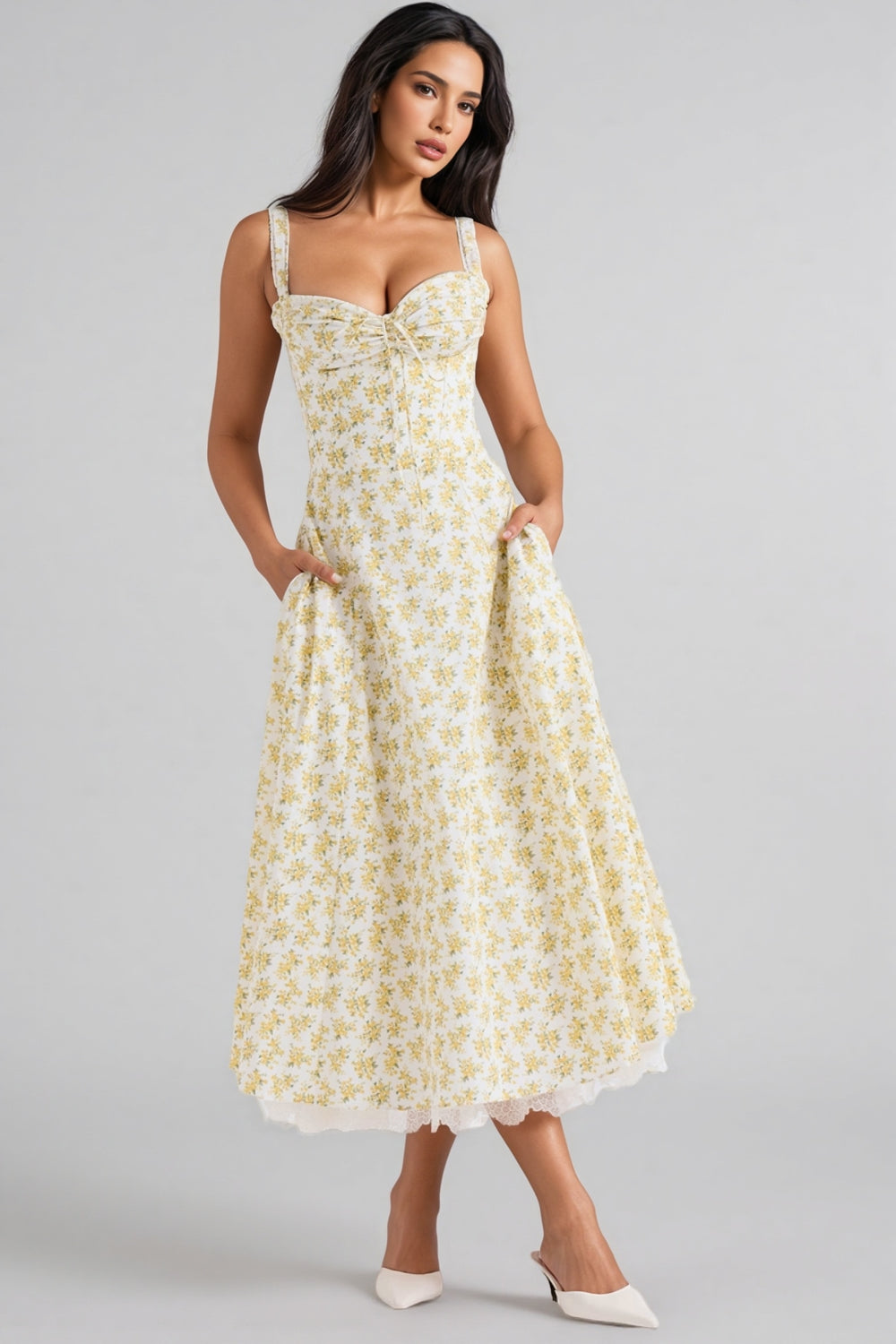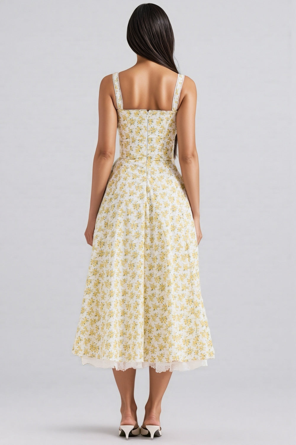 The Emork White Vintage Floral Print Cotton Midi Dress is a charming and elegant piece that captures the essence of vintage fashion. Crafted from soft cotton fabric. this dress features a delicate white base adorned with intricate floral prints in subtle hues. The design includes thin shoulder straps and a sweetheart neckline. adding a touch of feminine grace. The fitted bodice accentuates the waist before flowing into a gently flared skirt. creating a timeless A-line silhouette. The midi length of the dress falls gracefully below the knees. while the scalloped hem adds a whimsical touch. This dress is perfect for springtime gatherings. garden parties. or any occasion where you want to exude effortless elegance and vintage charm.