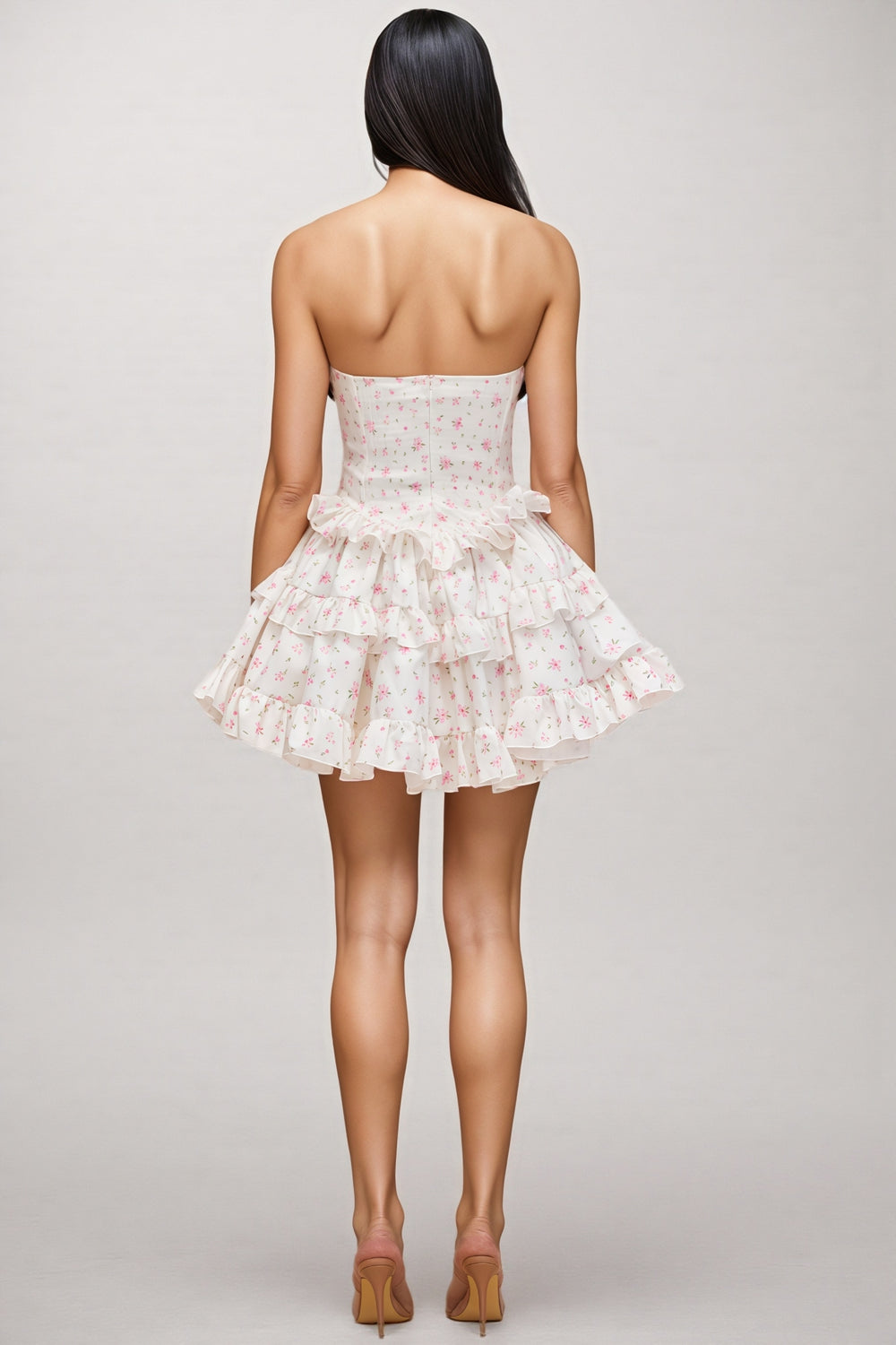 The Esther Floral Print Strapless Tiered Mini Dress is a charming and feminine piece that exudes a fresh and vibrant vibe. This strapless mini dress features a delicate floral print in soft pink hues against a crisp white background. creating a visually appealing contrast. The bodice is fitted and adorned with a lace-up detail at the front. adding a touch of allure and customization to the fit.