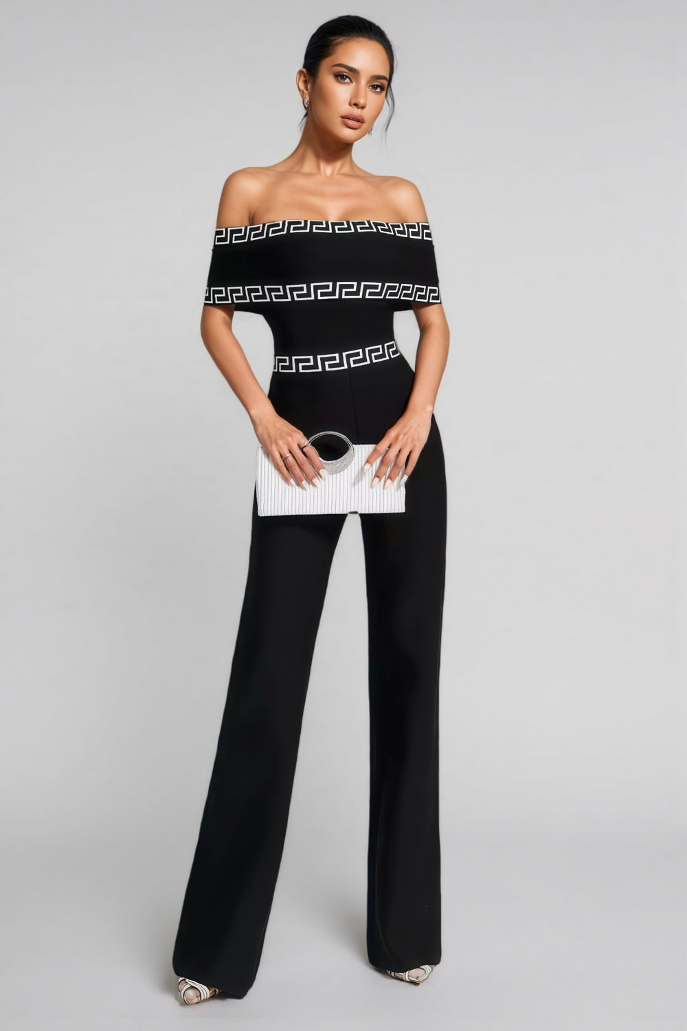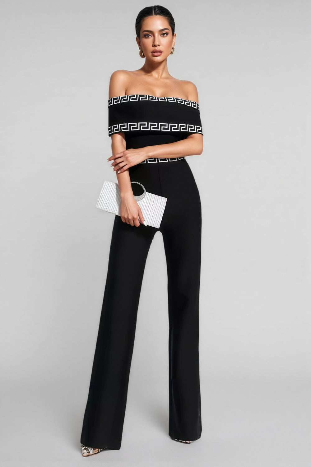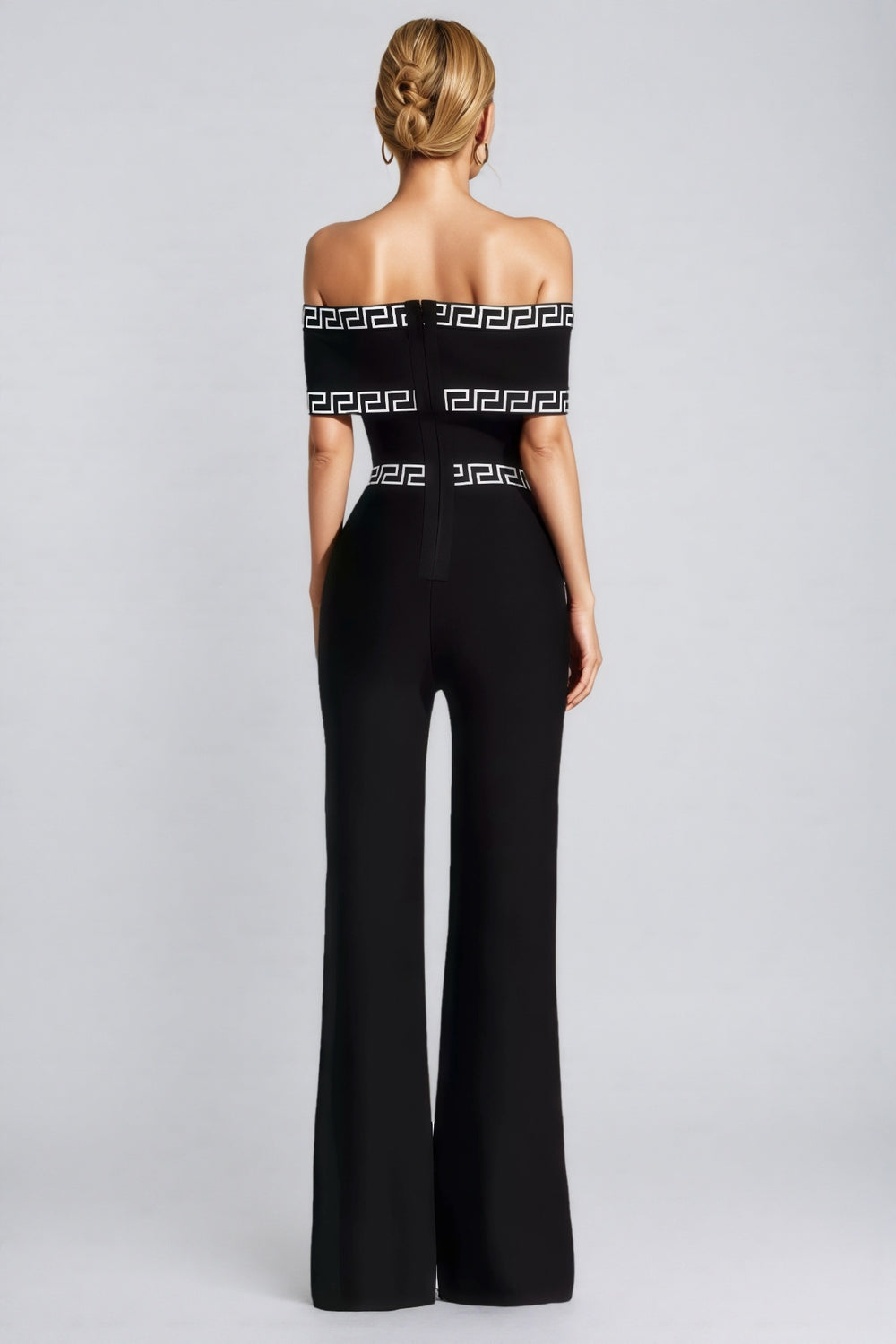 The Ferlac Black Printed Bandage Jumpsuit is a sophisticated and chic piece of clothing that exudes elegance. This jumpsuit features a black base with striking printed patterns that add a touch of glamour. Designed with a bandage-style fit. it contours beautifully to the body. highlighting the wearer's silhouette. The high-waisted cut and wide-leg trousers contribute to a flattering and comfortable fit. making it suitable for various occasions. Whether dressed up or down. this jumpsuit is sure to make a lasting impression.