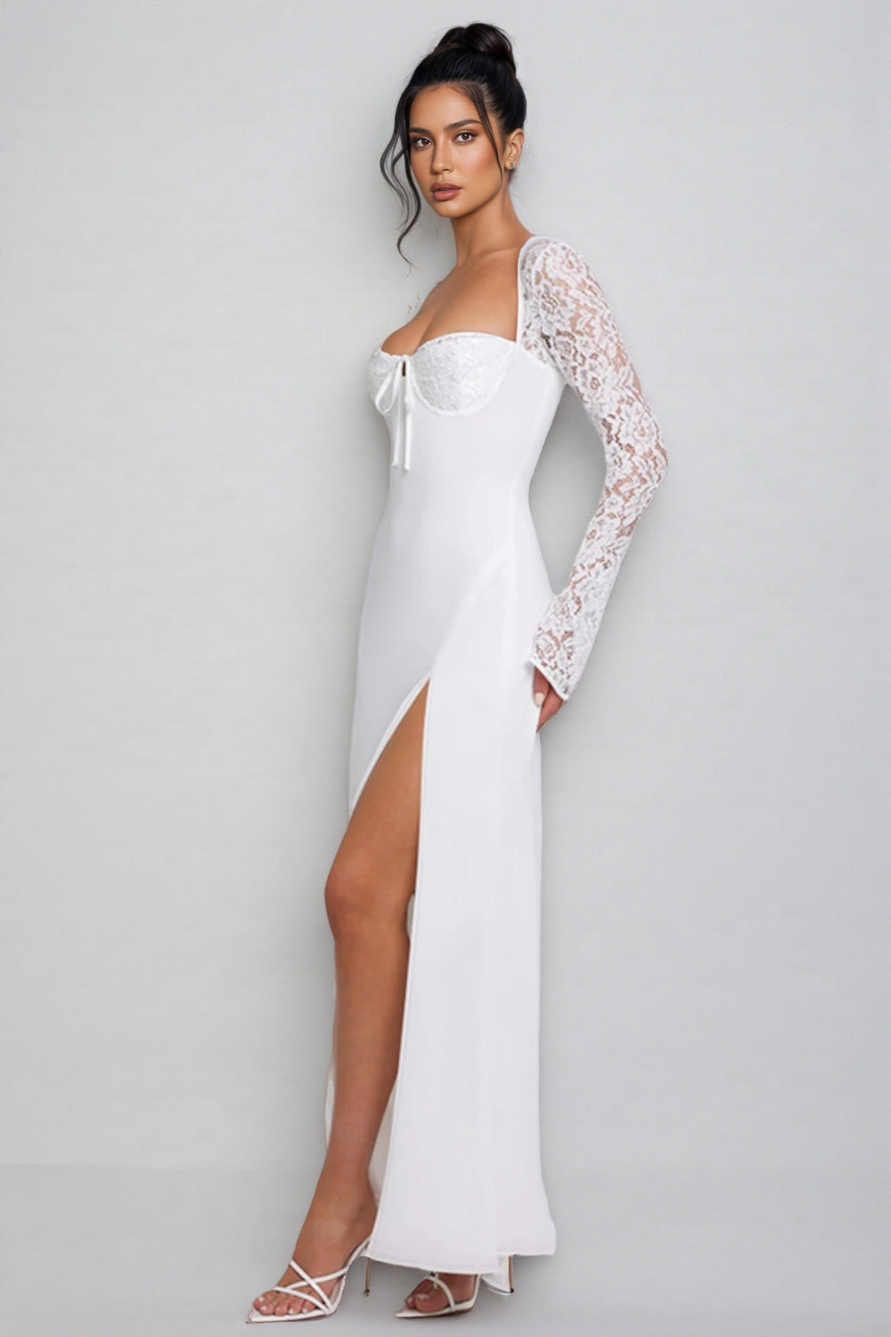 The Heli Lace Split Maxi Dress to enhance your elegance. Intricate lace sleeves. decorated with floral patterns. provide a subtle contrast to the smooth. flowing fabric of the garment. creating a harmonious blend of textures. The back of the gown is a charming open design that adds an element of surprise and seduction. Thigh-high slit is a bold statement. glimpsed with grace and confidence with every step.