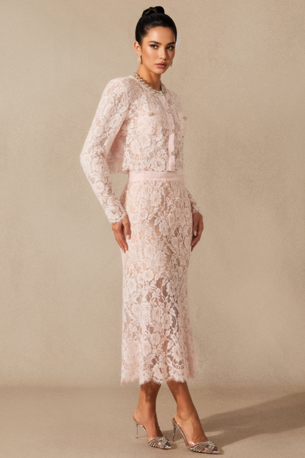 The Islay Long Sleeve Floral Lace Midi Dress Set is an elegant two-piece ensemble featuring a delicate floral lace pattern throughout. This sophisticated set includes a long-sleeved midi dress crafted from intricate lace fabric that offers both coverage and allure. with the floral design adding romantic charm and visual interest. The midi length provides a perfect balance between modesty and modern style. while the long sleeves offer graceful coverage. As a coordinated set. it creates a polished. put-together look that's perfect for special occasions. formal events. or romantic evenings where elegance and sophistication are desired.