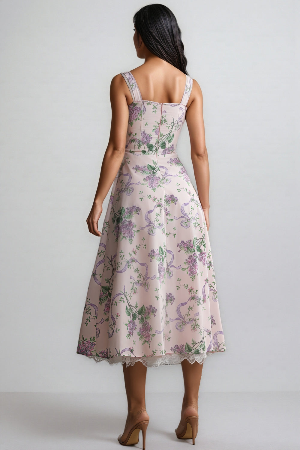 The Kerry Floral Print Lace Trim Midi Dress is a charming and elegant piece that embodies the essence of spring. This midi dress features a beautiful floral print with purple flowers and green leaves on a soft pink background. creating a fresh and vibrant look. The sweetheart neckline and thin straps add a touch of romance. while the lace trim at the hem provides a delicate finishing touch. The fitted bodice transitions into a flowy skirt. allowing for ease of movement and comfort. Perfect for garden parties. weddings. or any special occasion. this dress combines classic style with modern flair. making it a must-have addition to your wardrobe.