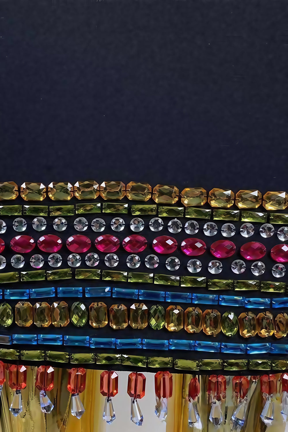 The Kirand Colourful Diamonds Halter Mini Dress is a vibrant and eye-catching piece perfect for lively occasions. This halter-neck mini dress features a sleek black bodice adorned with an array of colorful diamonds along the neckline and hemline. creating a dazzling effect. The multicolored gemstones add a playful and dynamic element to the outfit. making it stand out in any setting. Paired with black ankle-strap heels and a pink clutch. this dress exudes a blend of elegance and fun. ideal for parties and celebrations.