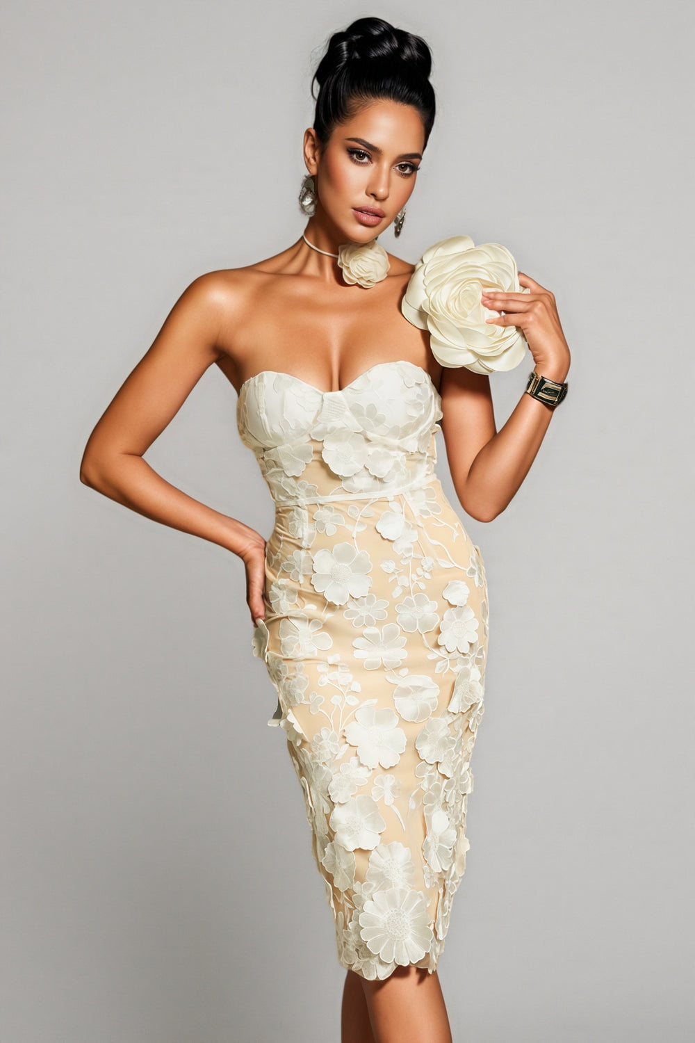 The Lux Strapless Flower Embroidered Midi Dress is a stunning piece that exudes elegance and femininity. This strapless midi dress features a bodice adorned with intricate flower embroidery. adding texture and visual interest. Crafted from delicate fabric. the dress has a fitted silhouette that gracefully contours the body. ending just below the knees. Its neutral tones and floral details make it versatile for various occasions. from weddings to cocktail parties. The dress combines sophistication with a touch of whimsy. ensuring the wearer feels confident and beautiful.