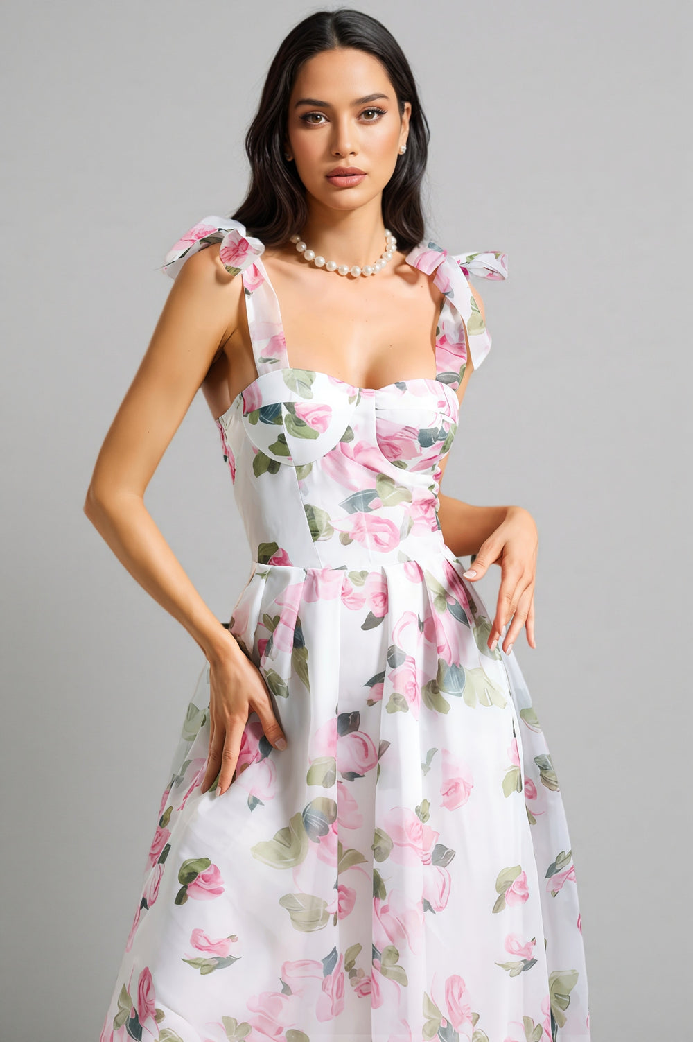 The Lyric Printed Strap Midi Dress embellished with pink and green flower patterns not only makes you look slim. but also tall. making it easy to handle various occasions. Whether you are a young girl or a mature woman. you can find your own beauty.