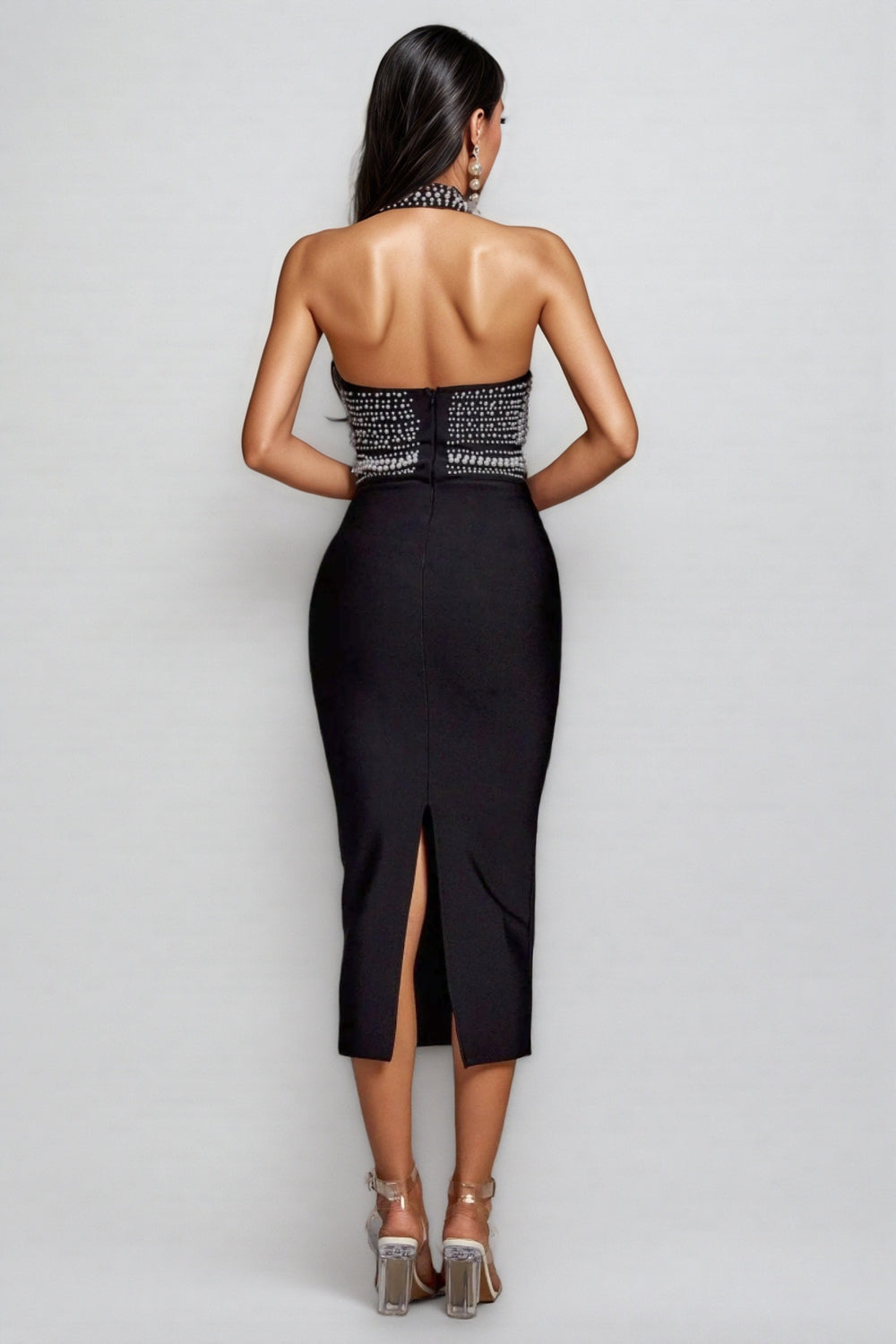 This Maia Pearl Halter Bandage Midi Dress features a hanging neck design on the upper body and exquisite white rhinestones. showcasing an elegant temperament. The lower body features a hip hugging design. perfectly outlining the graceful figure of women. The overall design is both fashionable and sexy. suitable for wearing in various occasions.
