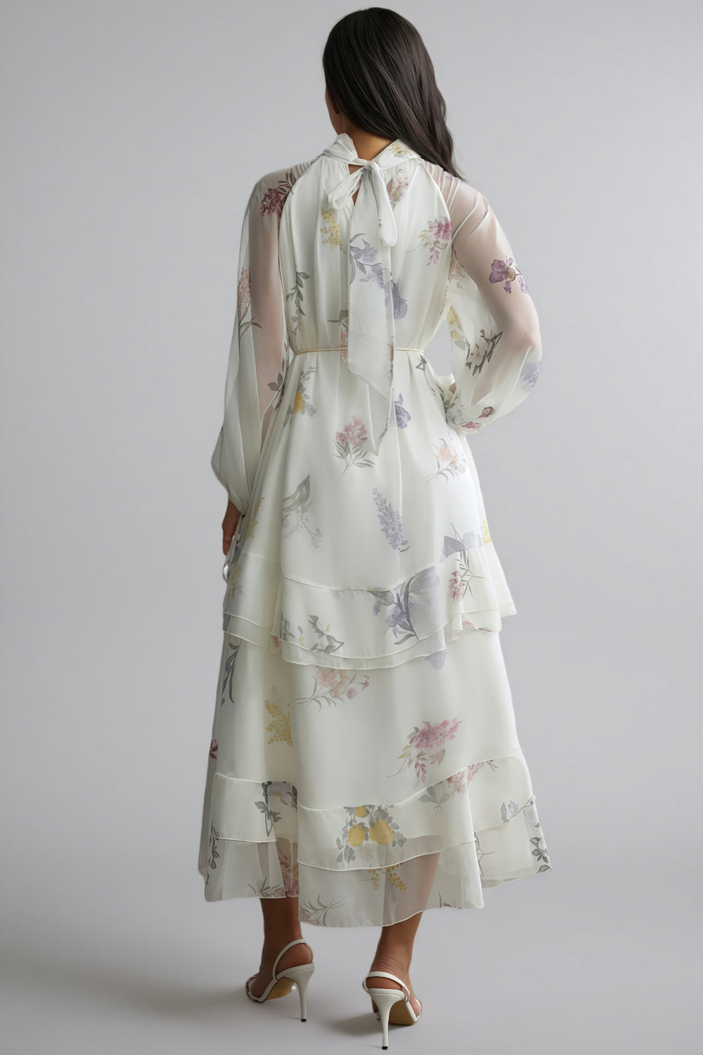 The Nadim Floral Print Puff Sleeve Maxi Dress is a delicate and feminine piece that captures the essence of springtime beauty. This white dress features a soft floral print in subtle shades of pink. purple. and green. adding a touch of nature-inspired charm. The puff sleeves are gathered at the wrists with tie details. creating a romantic and vintage-inspired look. The high neckline adds a classic touch. while the tiered skirt flows gracefully to the floor. giving the dress a light and airy feel. Perfect for garden parties. weddings. or any special occasion. this maxi dress combines elegance with a whimsical floral motif.