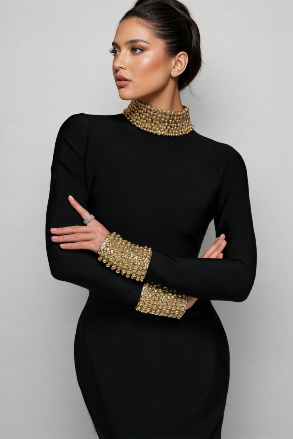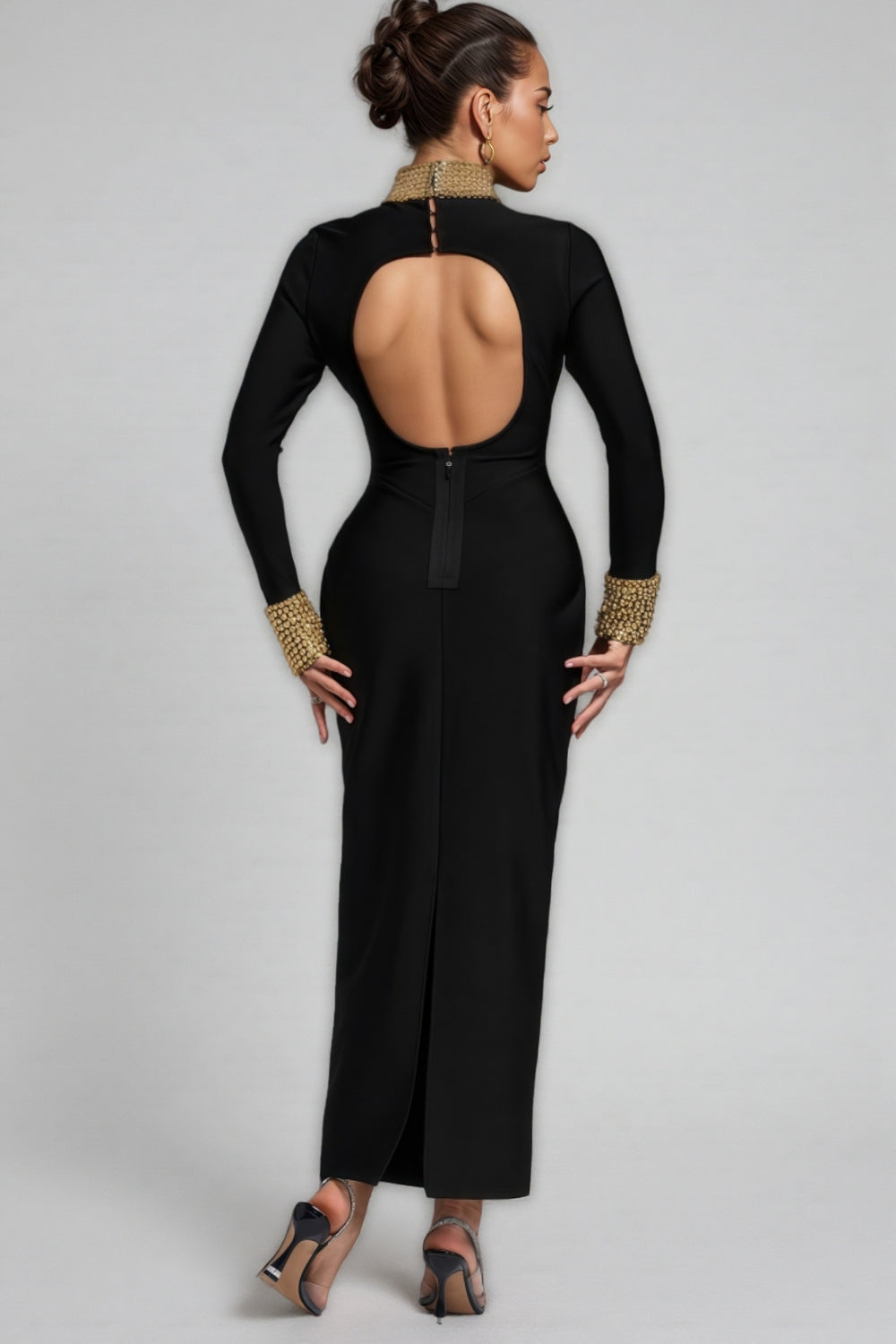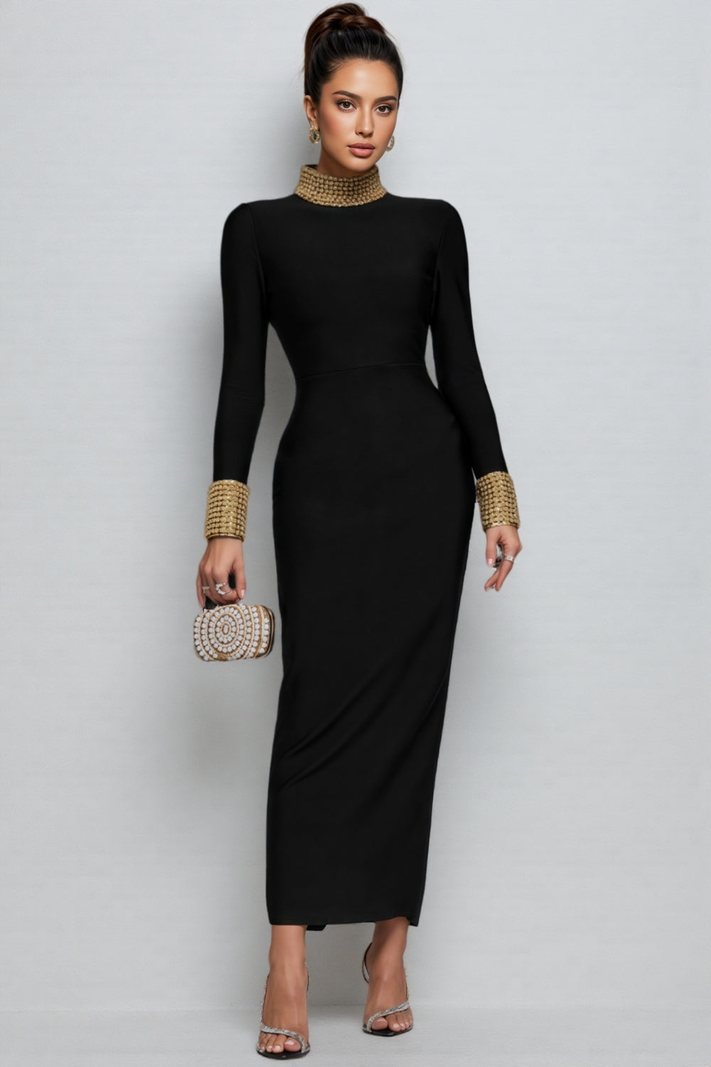 The Ogaka Diamante Bandage Maxi Dress is a stunning piece that epitomizes elegance and sophistication. Crafted from luxurious diamante bandage material. it offers a form-flattering fit while maintaining a comfortable stretch. The long sleeves and high neckline add a touch of classic glamour. making it perfect for formal occasions or evening events. Its timeless design ensures versatility. allowing it to transition seamlessly from one stylish setting to another.