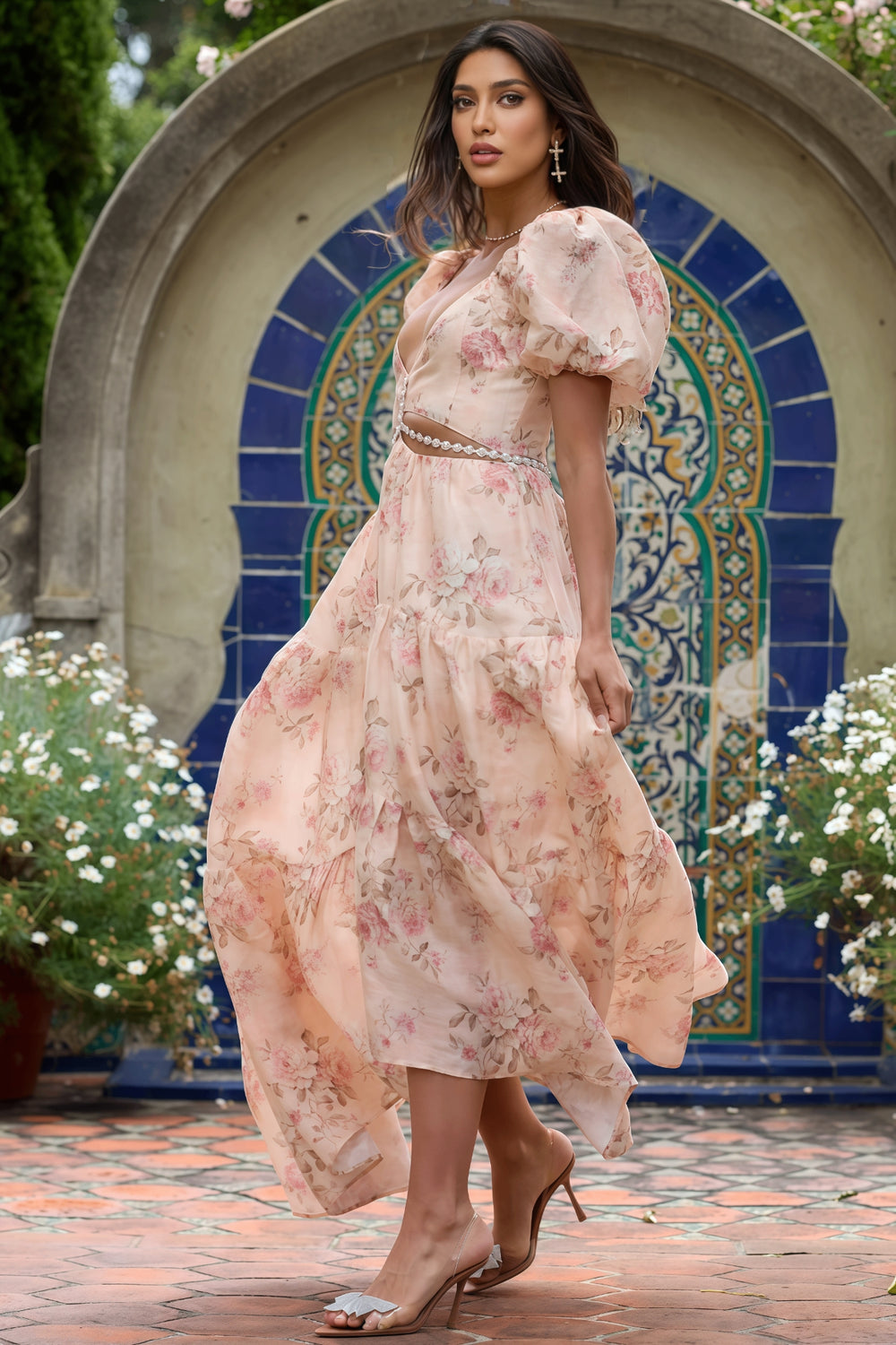 The Orlana Printed High Split V-Neck Maxi Dress is a stunning piece that exudes elegance and femininity. Crafted from light pink fabric adorned with delicate floral patterns. this dress features a flattering high split design paired with a sophisticated v-neckline. The waist is accentuated by a unique cut-out detail embellished with intricate beading. adding an extra touch of glamour. Flowing into a full maxi skirt. the dress creates a graceful silhouette perfect for any occasion.