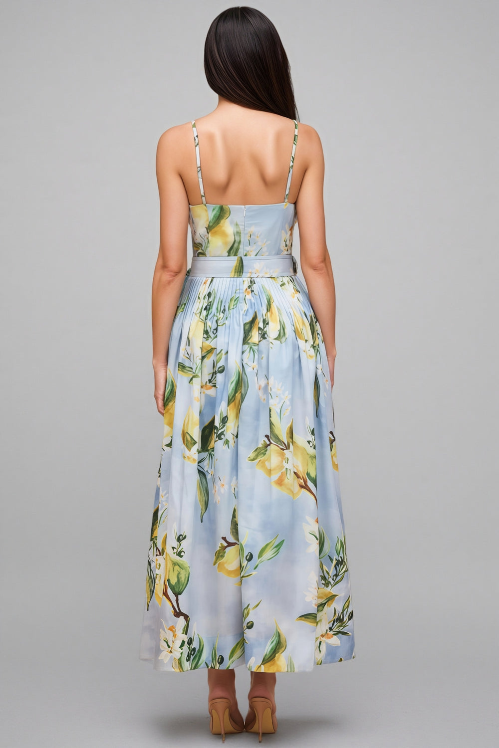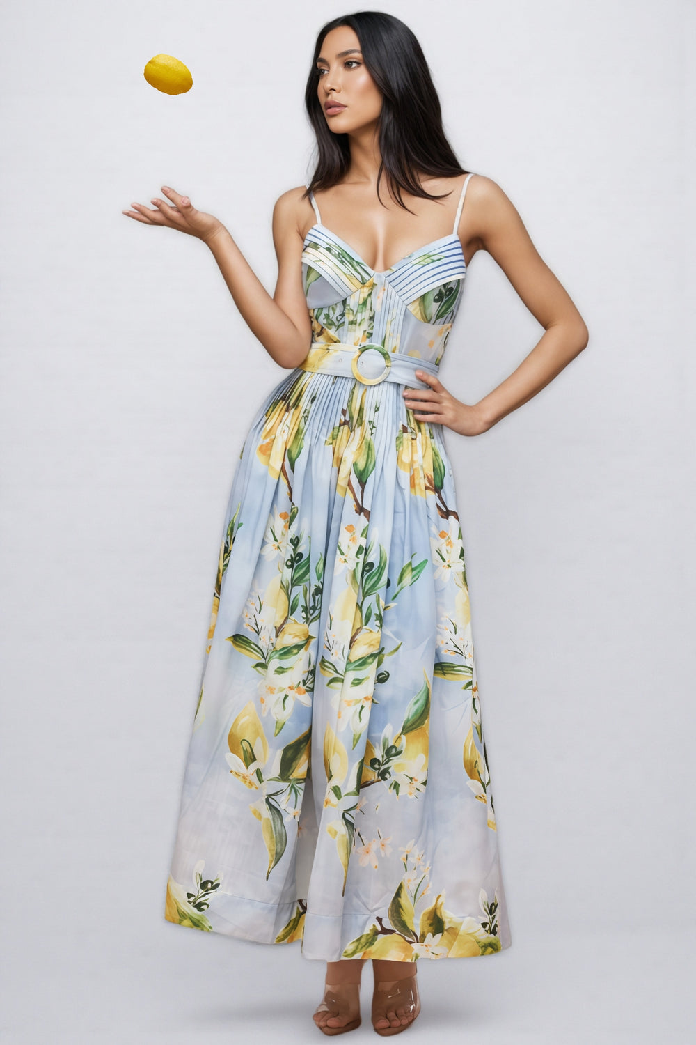 The Paca Lemon Print Spaghetti Strap Maxi Dress is a delightful and refreshing piece perfect for sunny days and warm weather. This maxi dress features thin spaghetti straps and a sweetheart neckline. offering a feminine and charming silhouette. The bodice is fitted and adorned with horizontal stripes. adding texture and visual interest. A matching fabric belt cinches at the waist. highlighting the figure and providing structure to the design.