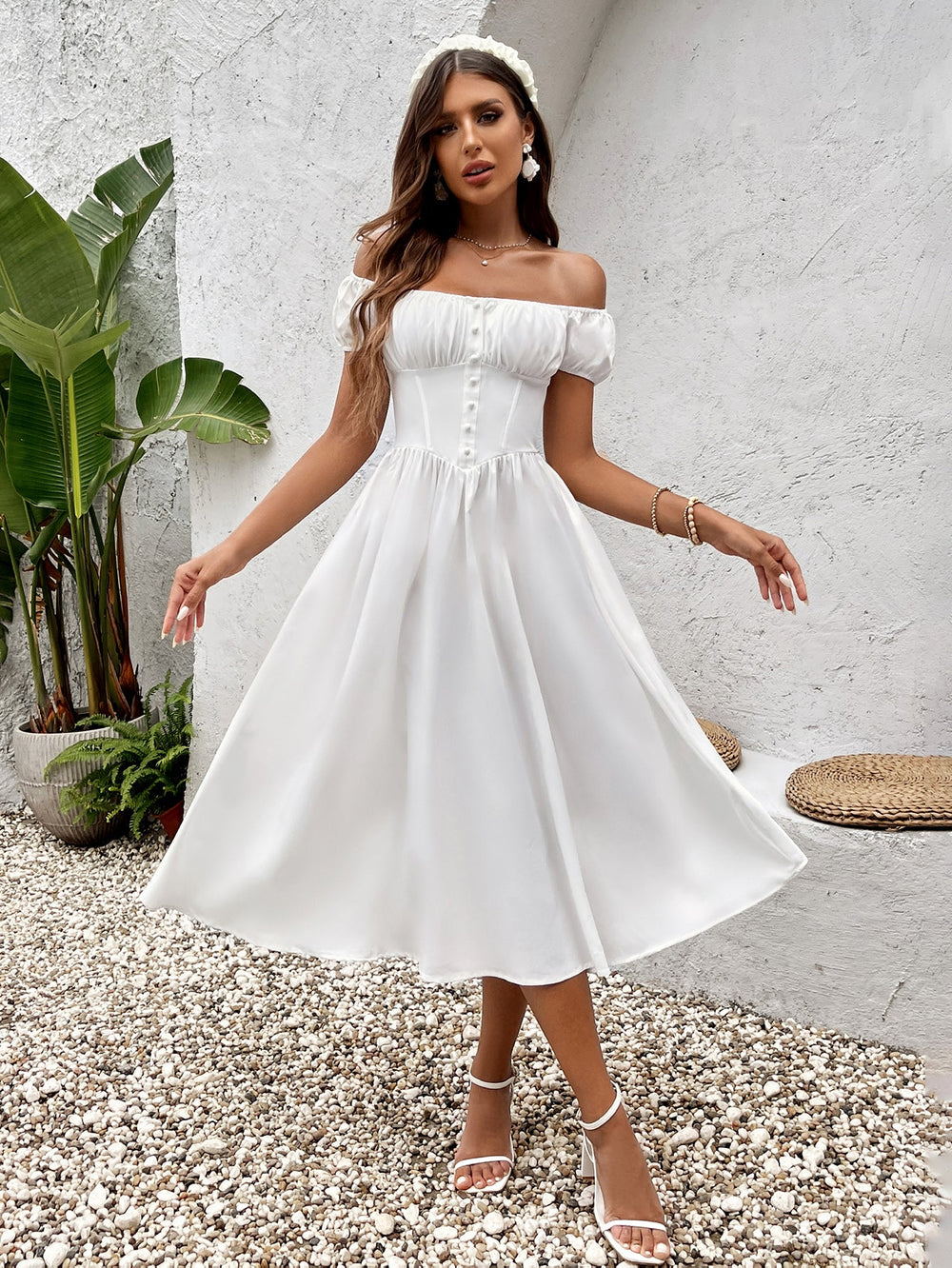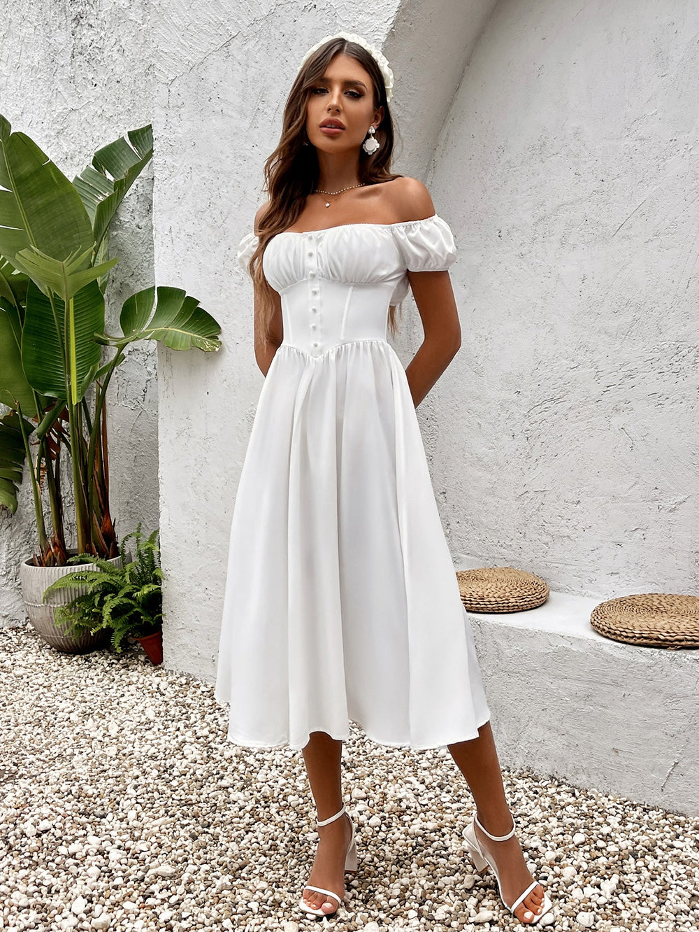 The Raldrek White Floral Bustier Mini Dress is a chic strapless mini-length garment featuring a crisp white base that serves as a perfect canvas for bold three-dimensional floral appliqués. This structured dress showcases two prominent blooms—one near the bust with soft pink petals and...