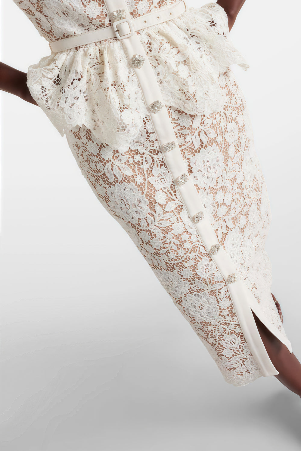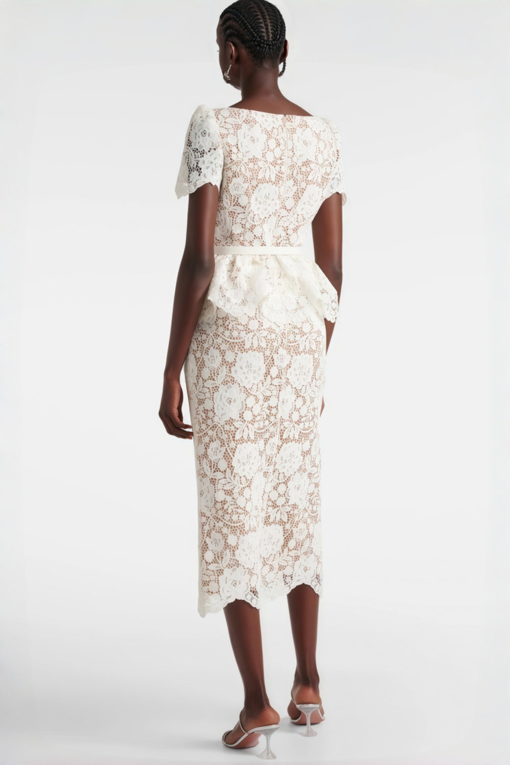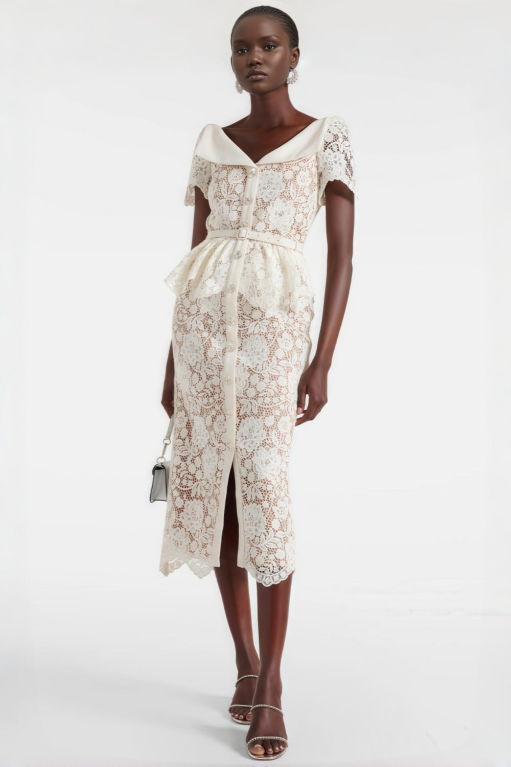 The Quin Lace Rhinestone Bottom Midi Dress is a stunning piece that combines elegance with a hint of sparkle. This dress features intricate lace detailing throughout. creating a delicate and feminine pattern. At the bottom. rhinestones add a touch of shimmer. giving the dress a glamorous finish. The midi length ensures a timeless and sophisticated silhouette. making it perfect for various occasions. Whether it's a cocktail party or a romantic dinner. this dress will make a lasting impression.