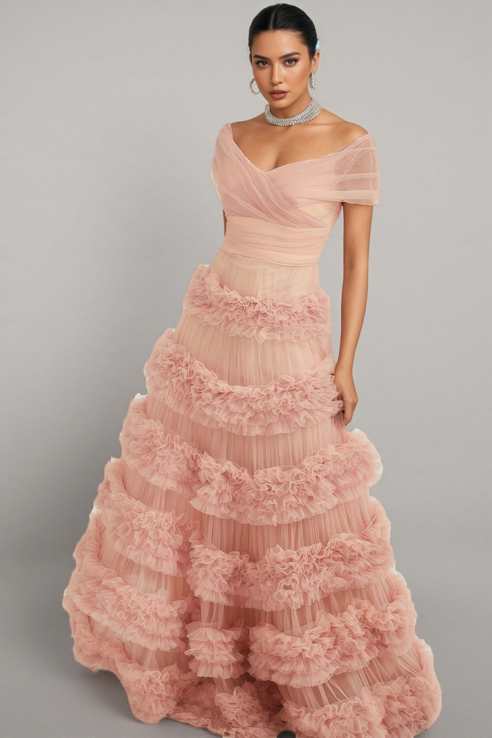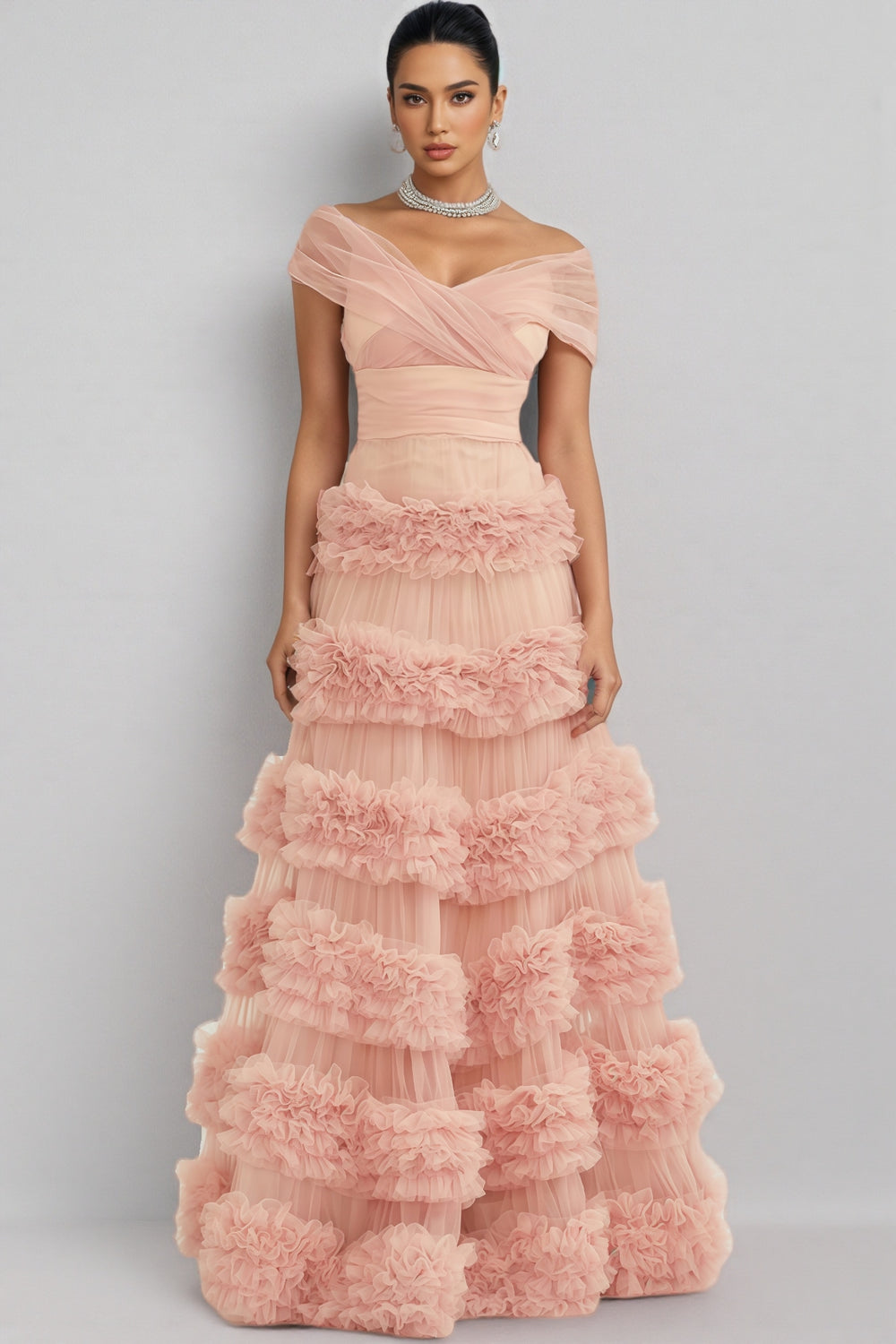 The Quinly Pink Tiered Maxi Dress is an exquisite piece that embodies elegance and romance. This floor-length gown features a series of voluminous. ruffled tiers that cascade gracefully down to the hem. creating a dreamlike silhouette. The soft pink hue adds a touch of sweetness and femininity. making it ideal for various occasions where a touch of glamour is desired. The off-the-shoulder design enhances its sophisticated yet playful appeal. ensuring you stand out in any setting.