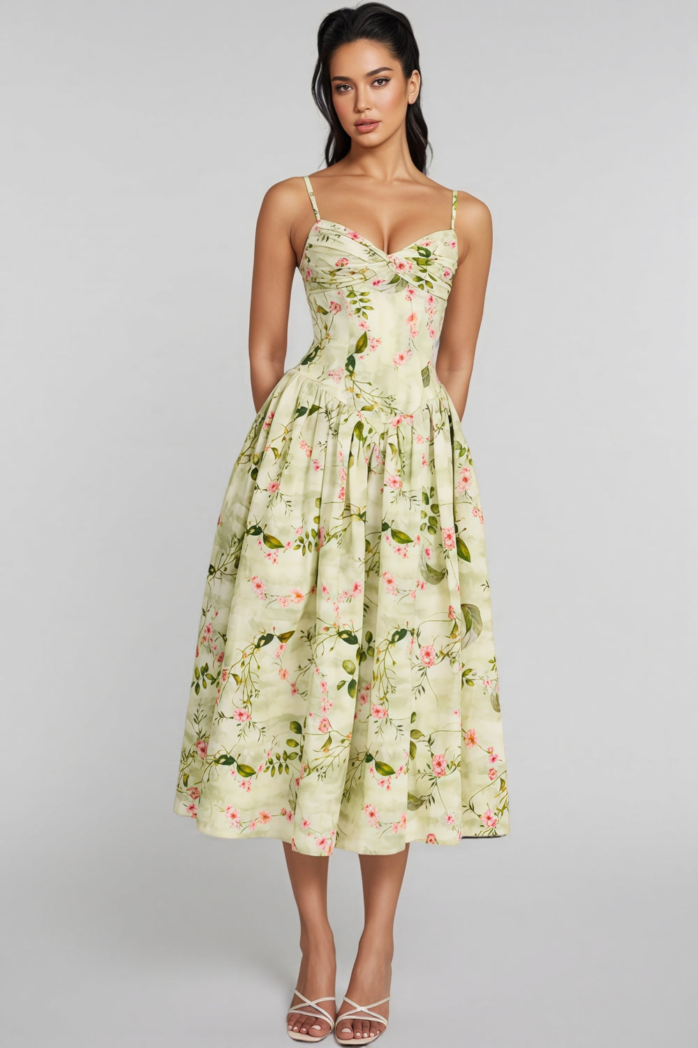 The Raleign Green Floral Print Ruched Midi Dress is a charming and feminine midi dress that blends a ruched bust with a floral print and a full skirt for a romantic. vintage - inspired look. Crafted from a light green fabric featuring delicate pink flowers and lush green leaves. it has thin spaghetti straps and a sweetheart neckline. adding a touch of romance. The bodice is designed with a gathered. ruched detail at the bust. creating a flattering silhouette. while the skirt flows into a midi length with a full. A - line shape. offering movement and a soft. airy feel. The vibrant green base with pink floral accents exudes freshness and charm. making it perfect for garden parties. summer weddings. or casual outdoor events. This dress balances intricate floral printing with a ruched bust detail and a flowing skirt. ensuring a captivating. timeless look for those who embrace romantic. nature - inspired fashion. Its combination of print. ruching. and midi length makes it an ideal choice for making a memorable. lively statement.