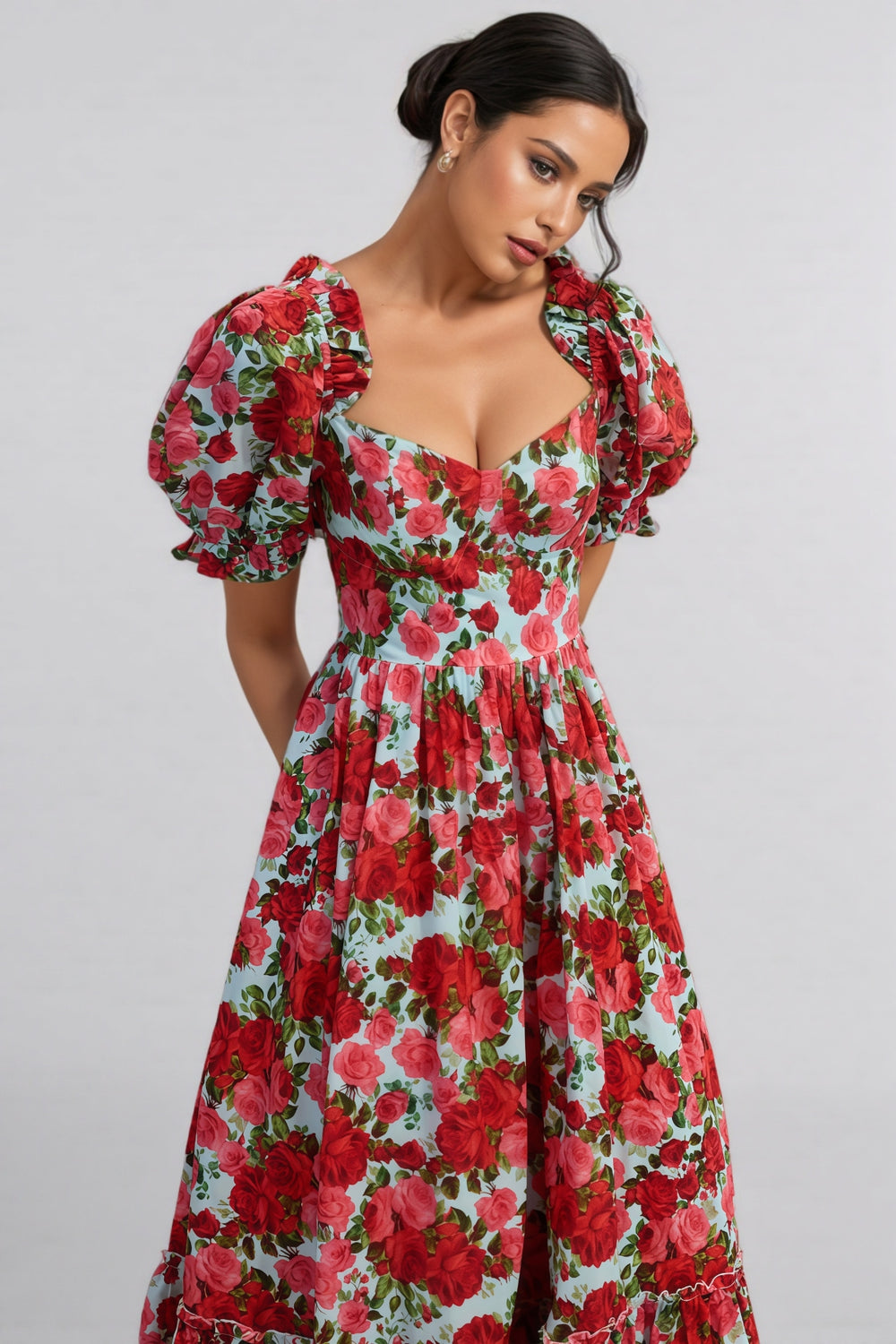 The Renee Floral Print Puff Sleeve Maxi Dress is a vibrant and elegant piece that embodies timeless style. This maxi dress features a striking floral print with large red roses set against a crisp white background. creating a visually captivating contrast. The puff sleeves add volume and a touch of retro charm. while the sweetheart neckline enhances the feminine silhouette. The fitted bodice transitions into a full. flowy skirt with ruffled tiers. offering both comfort and movement. Ideal for summer gatherings. outdoor events. or a romantic date night. this dress effortlessly combines classic elements with contemporary flair.