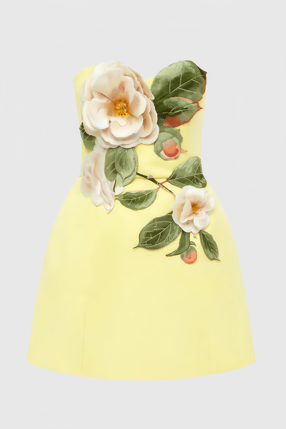 The Rex Yellow Applique Floral Bustier Mini Dress is a vibrant and elegant piece that marries bold color with artistic detailing. Crafted from a smooth yellow fabric. this mini dress features a strapless bustier design that accentuates the waist. paired with a full. flared skirt for a retro - inspired silhouette. The focal point is the oversized floral appliqué—large white blooms with golden centers. lush green leaves. and subtle orange accents—that adorns the bodice. creating a striking. three - dimensional botanical effect. Perfect for cocktail parties. garden weddings. or summer soirees. this dress balances playful charm with sophisticated craftsmanship. making it an ideal choice for those who wish to make a memorable. sunny statement.
