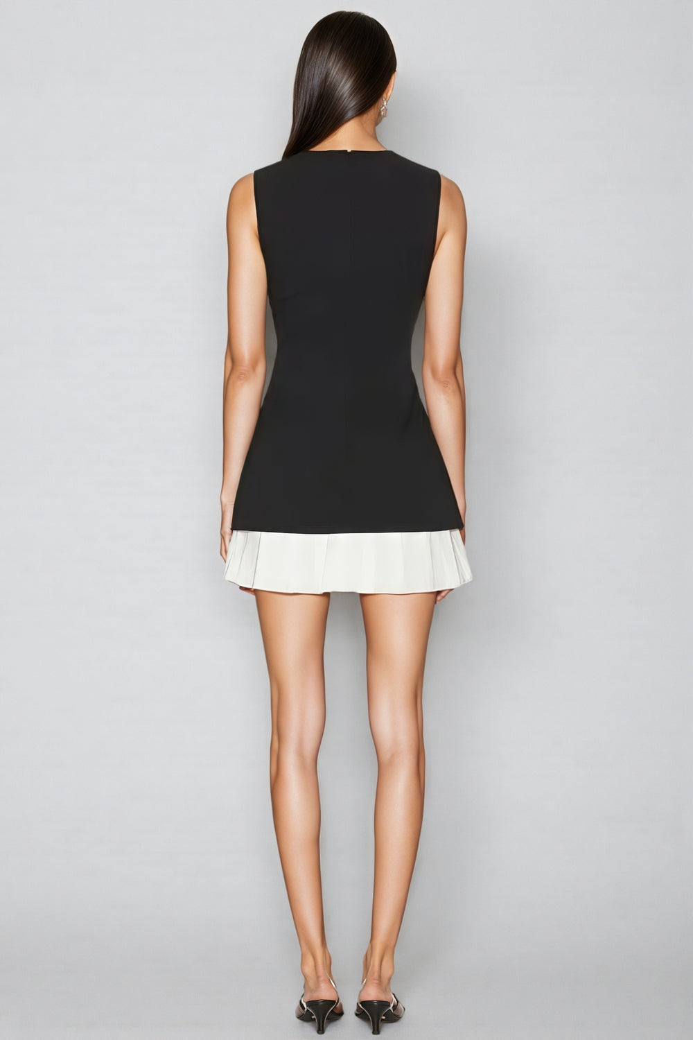 The Rosariy Black Sleeveless Mini Dress is a sleek and versatile piece that embodies minimalist chic. Crafted from a stretchy. form - fitting fabric. this mini dress features a sleeveless design and a round neckline. creating a clean. modern silhouette. The dress is divided into two contrasting sections: a solid black upper half and a crisp white pleated skirt. adding a touch of visual interest without overwhelming simplicity. Its short length makes it perfect for casual outings. daytime events. or evenings when paired with heels. This dress balances understated elegance with practical style. making it an ideal choice for those who appreciate timeless. easy - to - wear fashion.
