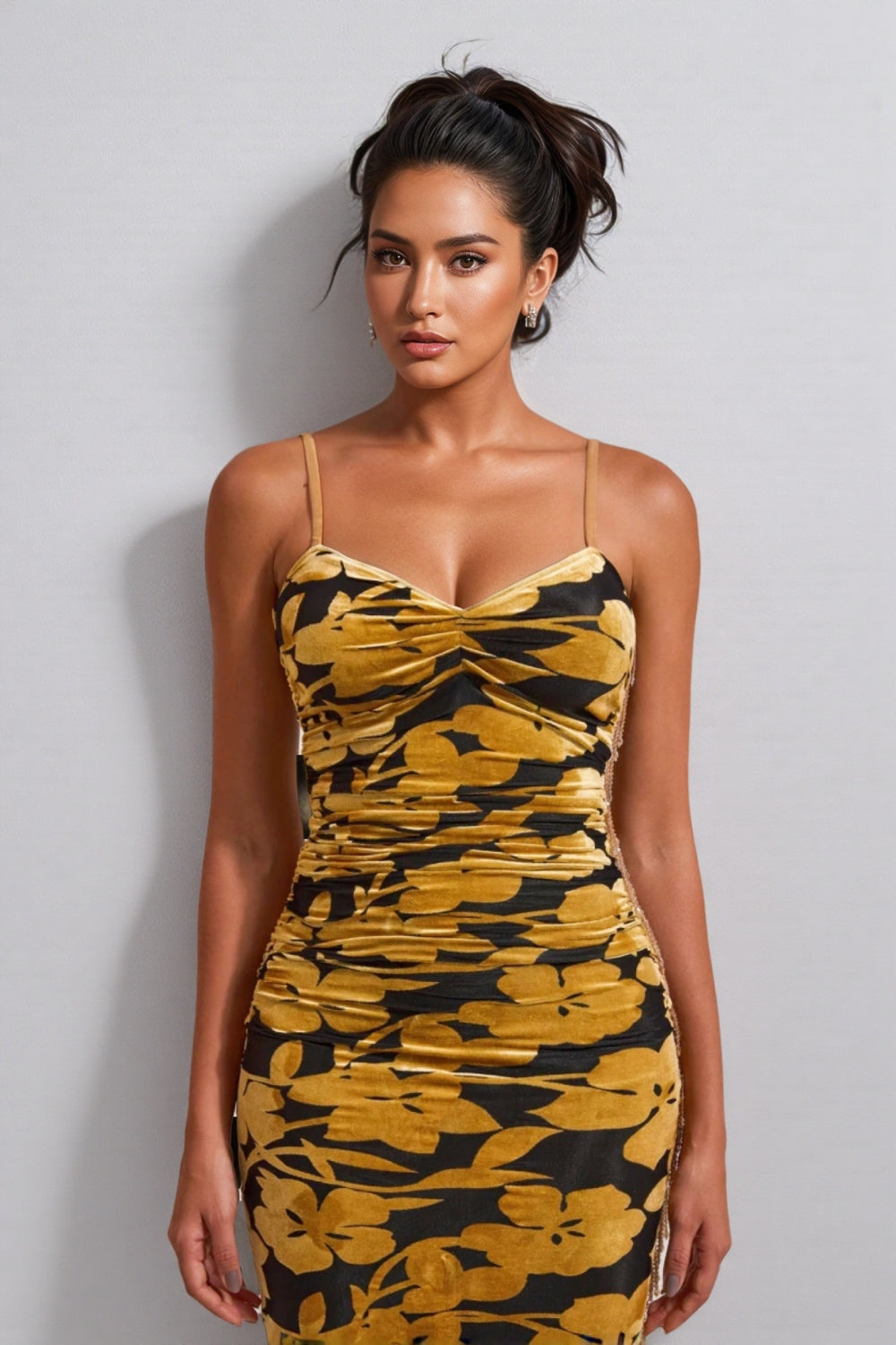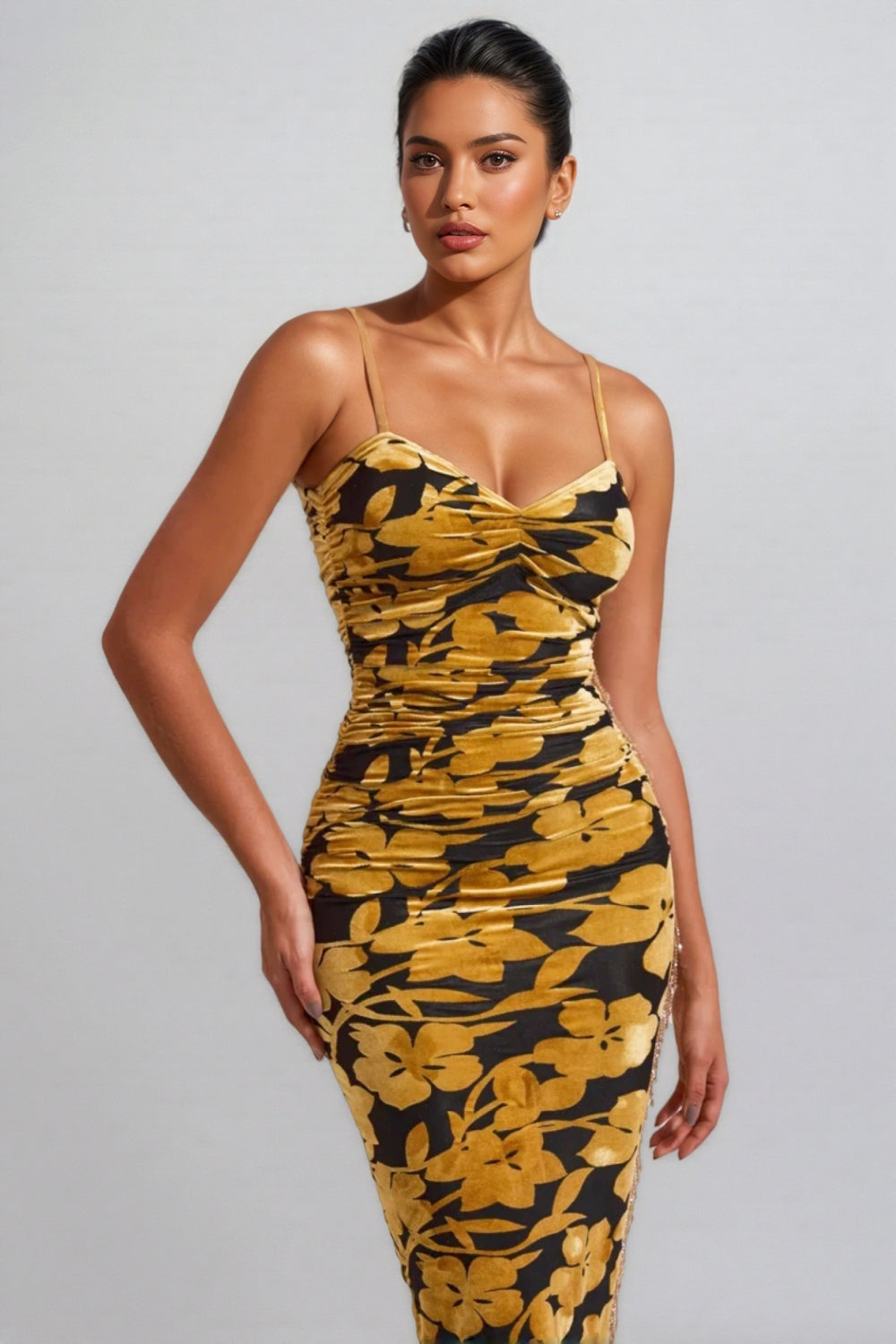 The Seraphina Velvet Floral Ruched Slip Midi Dress features a striking golden floral pattern. This dress is not only suitable for various solemn occasions. but its versatility also makes it an elegant choice for daily wear. Paired with a pair of exquisite high heels. highlight your tall figure and outstanding temperament. Undoubtedly. it is an indispensable masterpiece in the wardrobe of fashion elite women. and every time you wear it. it is a tribute to elegant life.