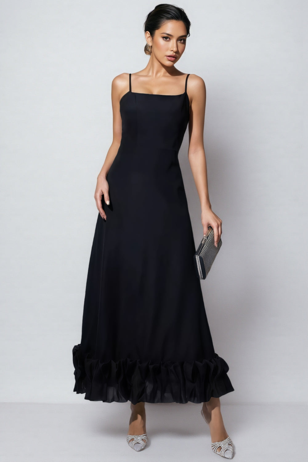 The Tavae Black A-line Maxi Dress is a timeless piece that embodies elegance and simplicity. This classic black dress features a square neckline and thin spaghetti straps. offering a chic and sophisticated look. The A-line silhouette flows gracefully down to the ankles. creating a flattering shape for all body types. The dress is adorned with charming ruffles at the hem. adding a playful yet refined detail to the overall design. Perfect for both formal occasions and evening outings. the Tavae Black A-line Maxi Dress is a versatile addition to any wardrobe.