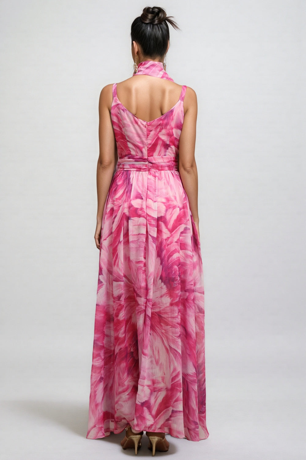 The Tereza Halter Printed Streamer Maxi Dress is a vibrant and flowing maxi dress that blends a halter neckline with a bold floral print and streamer - like details for a romantic. event - ready look. Crafted from a lightweight. sheer fabric. it features a halter neck with a matching choker. adding a touch of elegance. The deep V - neck plunges gracefully. enhancing its allure. The bodice is cinched at the waist with a fabric belt. creating a defined silhouette. The skirt flows into a full. floor - length style. adorned with a dynamic pink and magenta floral print that evokes a sense of movement and nature. Delicate streamer - like panels drape over the shoulders. adding a whimsical. ethereal touch. The soft. flowing fabric ensures comfort. making it perfect for garden weddings. evening galas. or tropical getaways. This dress balances bold printing with streamer accents and a maxi length. ensuring a captivating. dreamy look for those who embrace romantic. stylish fashion. Its combination of halter design. printed pattern. and streamer details makes it an ideal choice for making a memorable. enchanting statement.