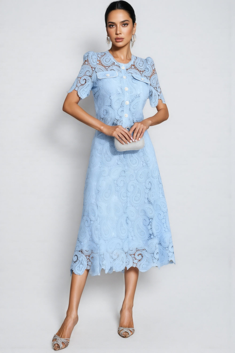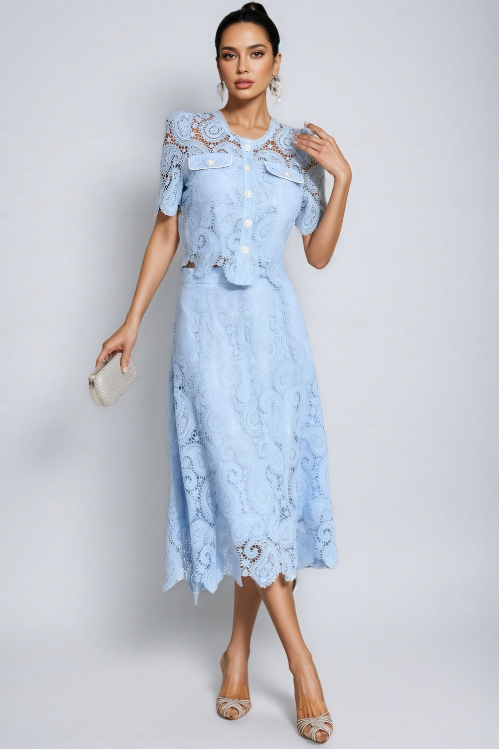 The Ternence Blue Lace Set Midi Dress Two-Piece Set is a beautifully coordinated ensemble featuring a delicate blue lace top and matching skirt. The top boasts short puffed sleeves and a round neckline. enhanced by intricate lace detailing and decorative buttons down the front. The skirt complements the top perfectly. made from the same blue lace material. and falls to midi length with a scalloped hemline.