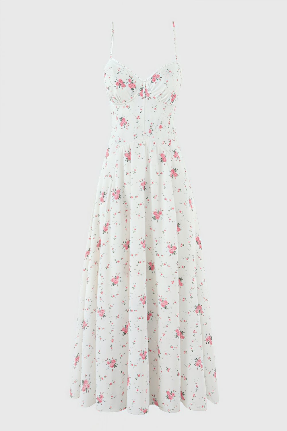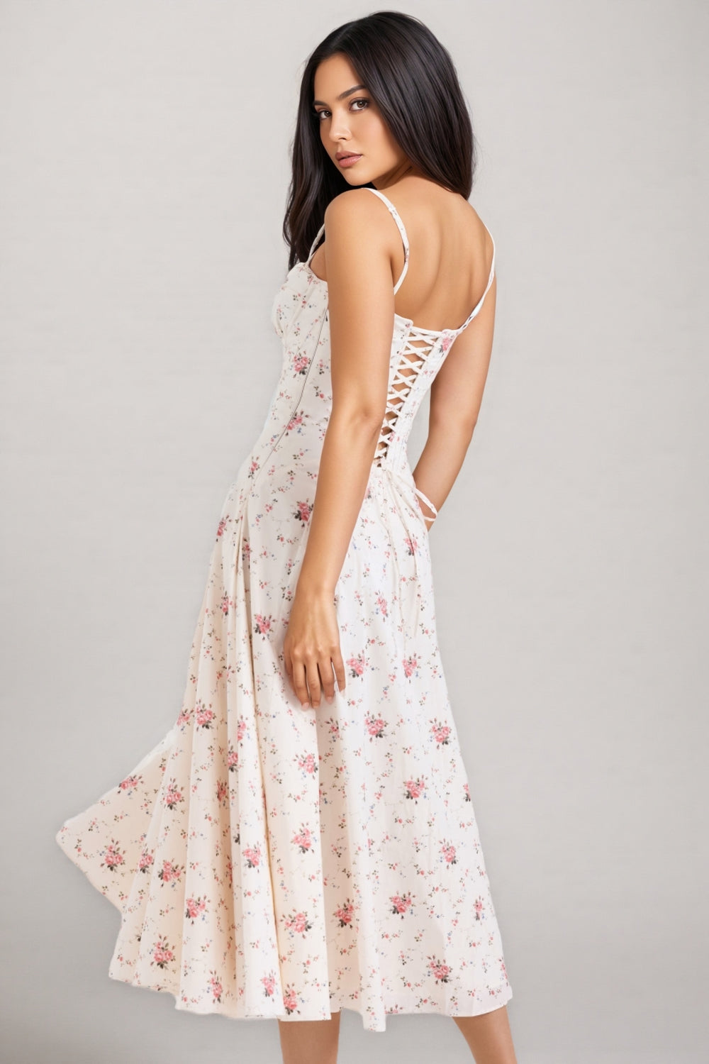 The Thora White Stretch Cotton Rose Print Midi Dress is a delicate and romantic piece that exudes timeless elegance. Crafted from stretch cotton. this dress offers both comfort and a flattering fit. It features thin straps and a sweetheart neckline adorned with subtle lace detailing. enhancing its feminine charm. The bodice is fitted. accentuating the waist before cascading into a full. midi-length skirt decorated with a lovely pattern of small pink roses. This dress is perfect for springtime events. garden parties. or any occasion that calls for a touch of floral beauty.