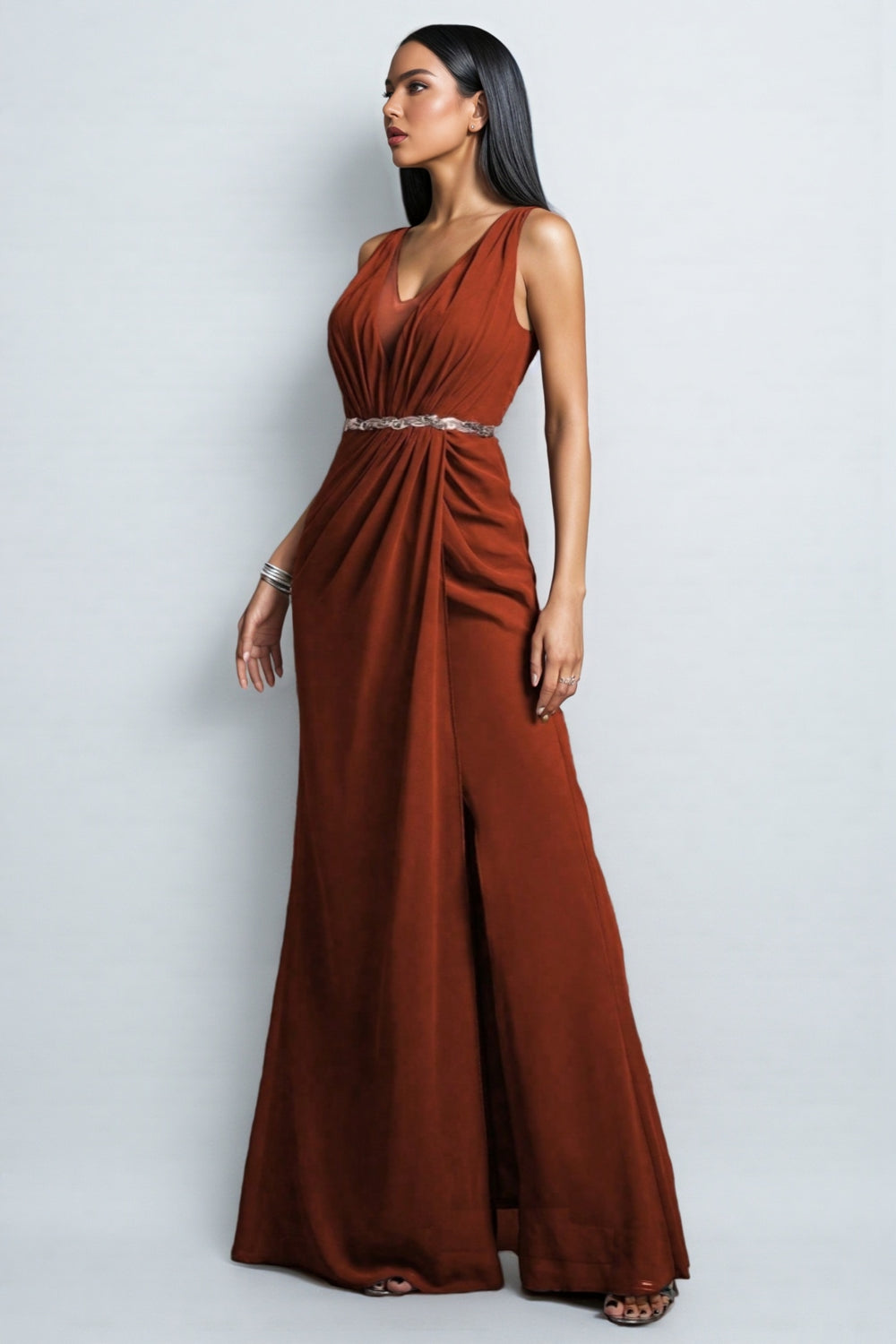 The Wani V-Neck Split Maxi Dress elegantly accentuates your silhouette. creating an exterior that exudes confidence and glamour. Beautifully draped and ruched at the waist. the elaborately embellished sequin belt adds a touch of glamour. The high split throughout the gown extends downwards. allowing glimpses of the leg silhouette and adding a touch of playfulness to the overall elegance.