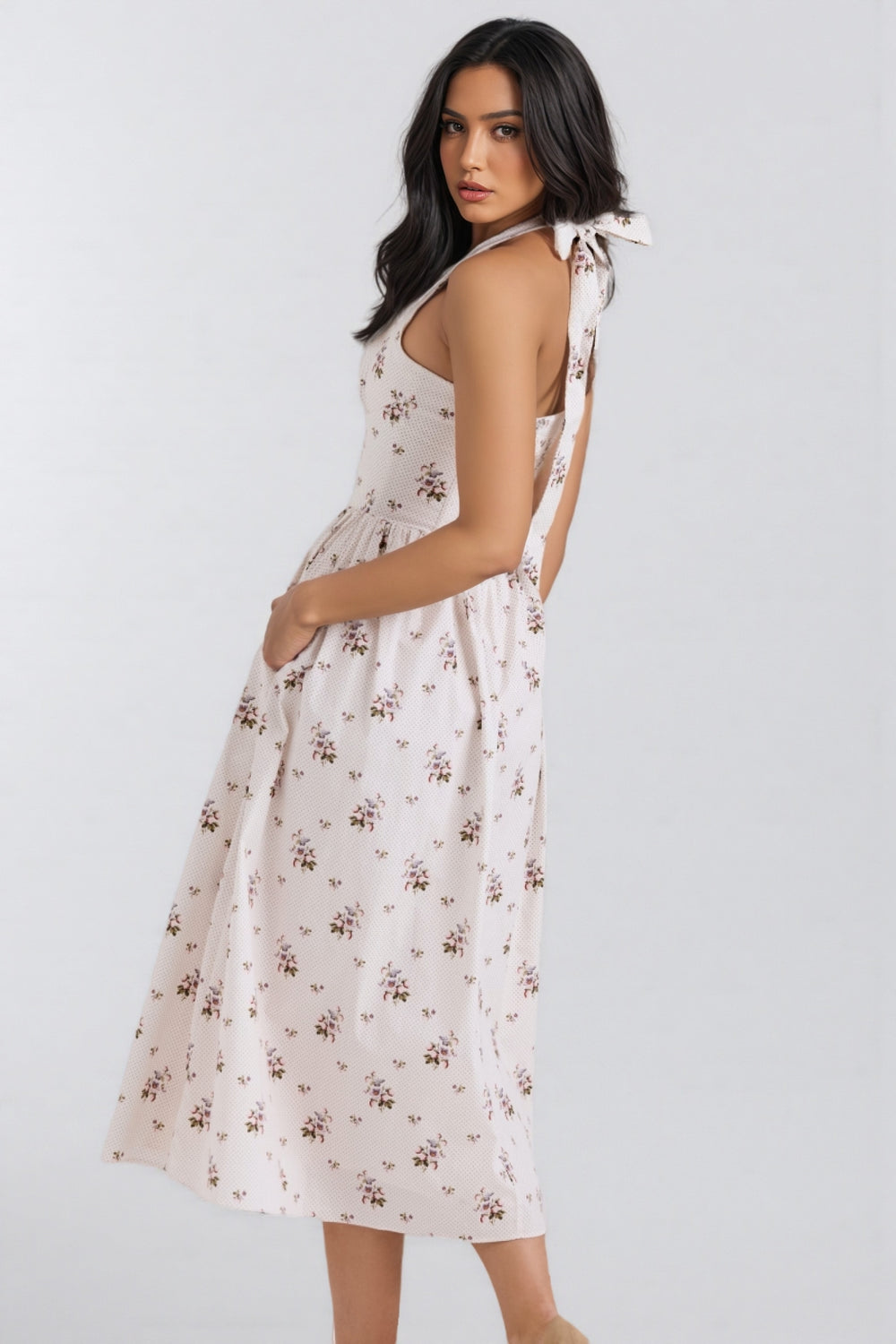 The Zinnia Floral Print Stretch Cotton Halter Neck Midi Dress is a charming and versatile piece perfect for various occasions. Crafted from stretch cotton fabric. this halter-neck dress features a delicate floral print in soft pastel colors on a light background. The fitted bodice with a sweetheart neckline accentuates the figure beautifully. while the gathered waist transitions into a flowy. midi-length skirt that adds a touch of femininity. The adjustable halter neck straps provide both comfort and style. making this dress suitable for warm weather and outdoor events. Pair it with sandals or wedges for a complete look that exudes effortless elegance.