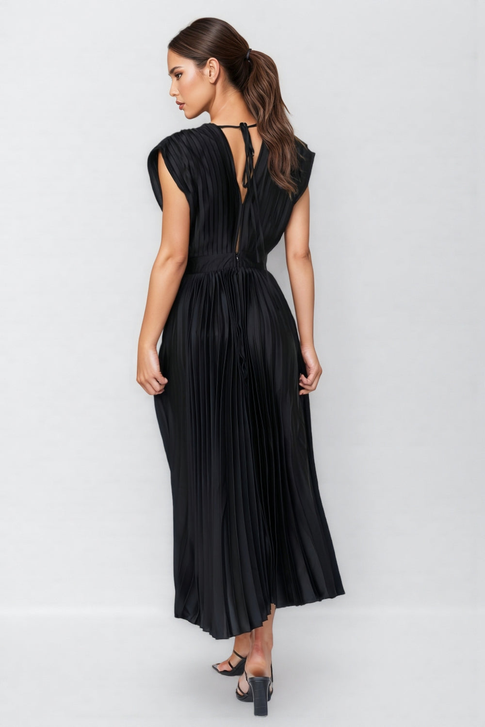 The Zola Sleeveless Pleated Maxi Dress-Black is the perfect blend of elegance and comfort for spring and summer. This dress features a deep v-neckline that adds a touch of sophistication. while the cap sleeves offer a modern and relaxed silhouette. The pleated texture throughout the dress creates a dynamic and pleasing effect. enhancing the overall design with movement and depth.
